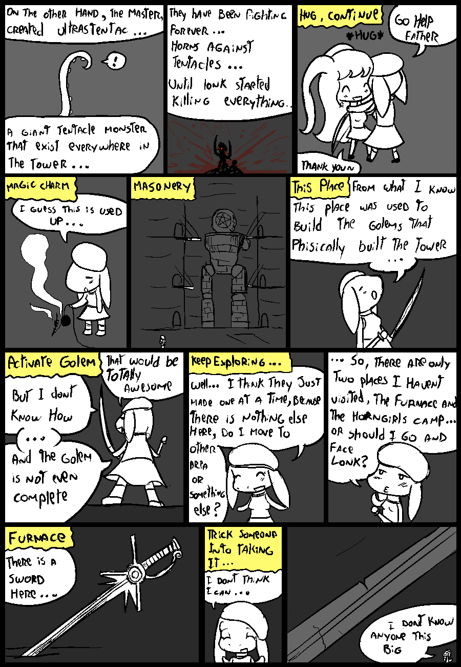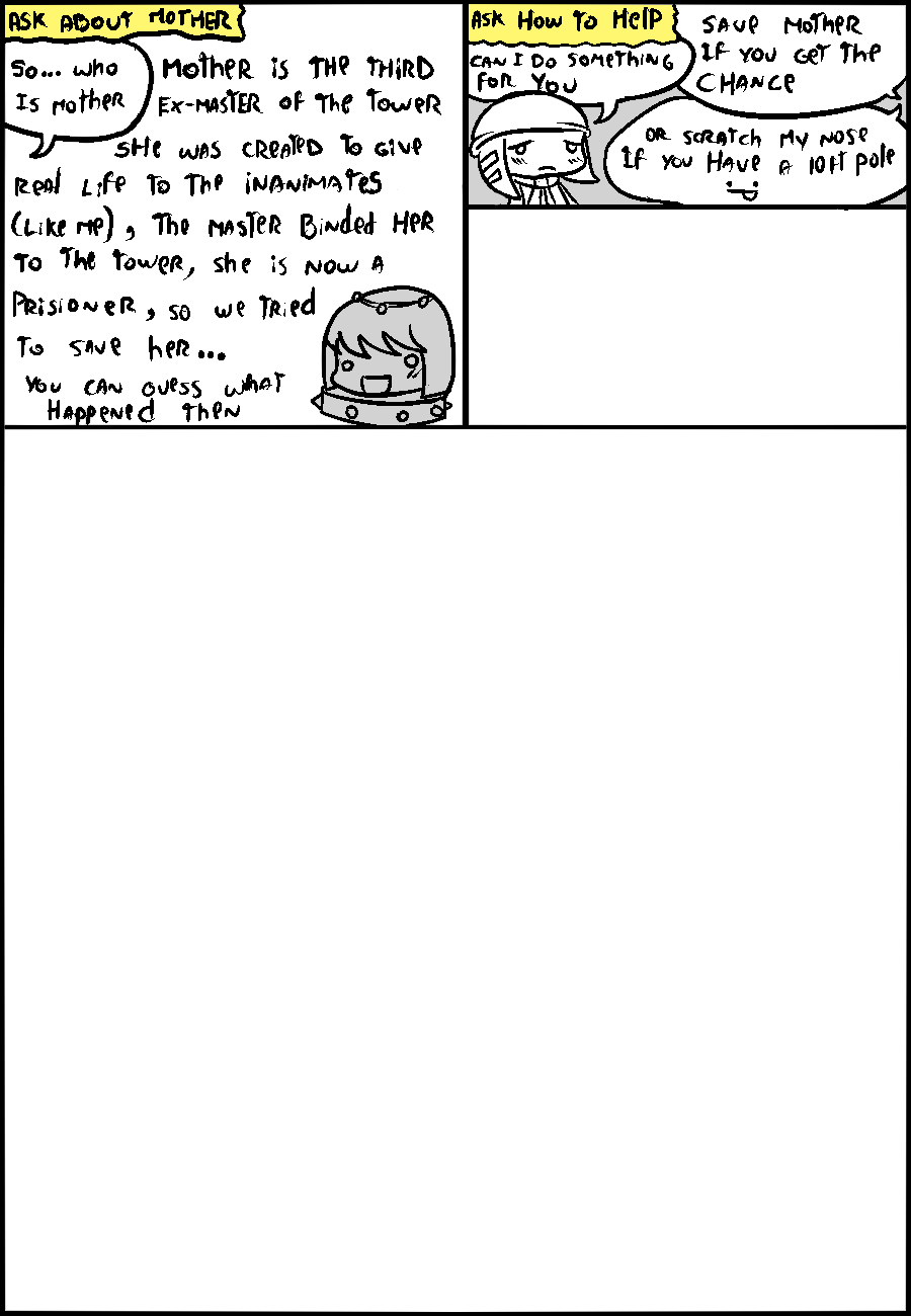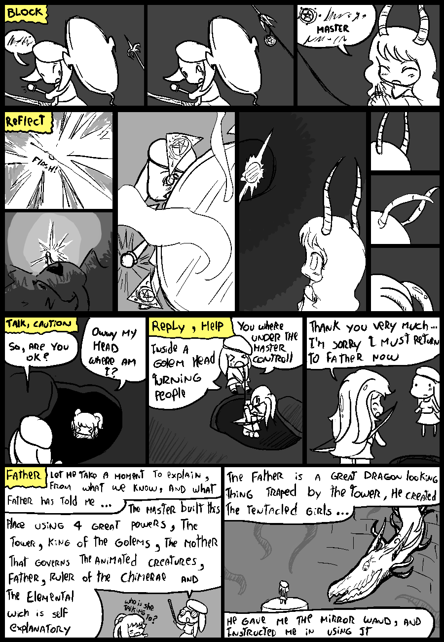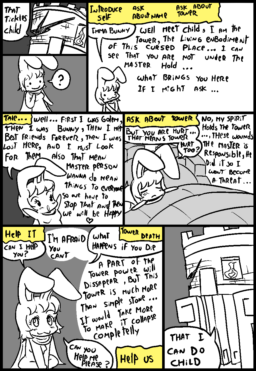 thanks for the exposition. us voices met the great golem king. he told us that with his death the tower would weaken, he gave the bunny girl the golem powers. and then when she left, he died, glad that he could do something to help. father probably wants to die too, to weaken the tower as well, but can't until he is sure his children are safe.