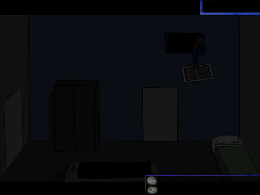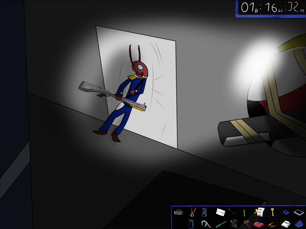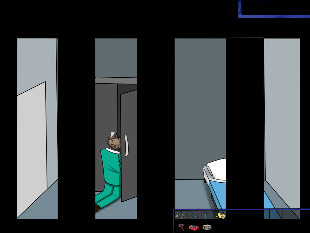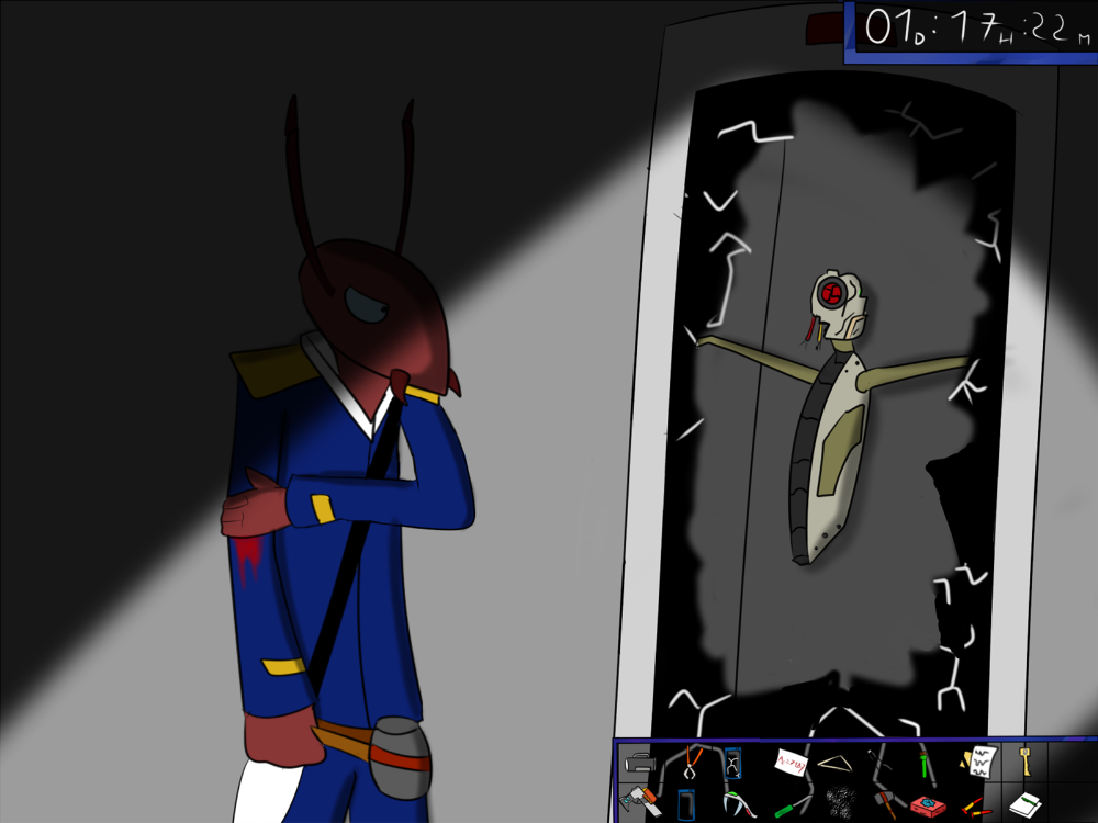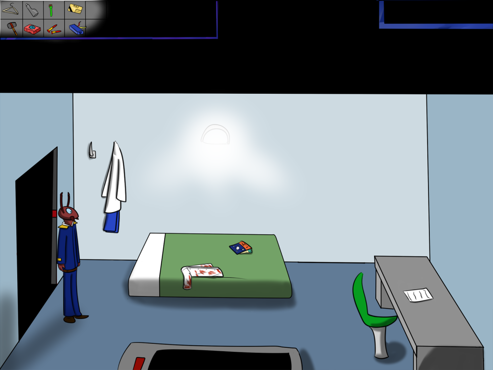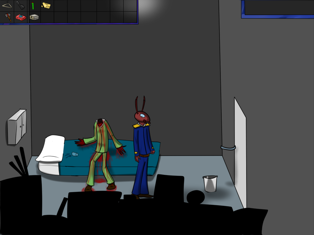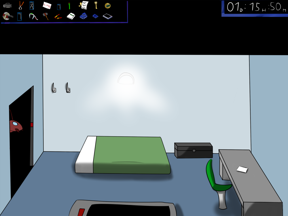 The last time, the janitor jammed the opening mechanism of the door with a piece of metal, then placed the bed behind so it couldn't be forced from outside. Tiak does the same, jamming the door with some random debris from the pile, but moving the bed would require pushing the corpse out, so he lets it be for now.