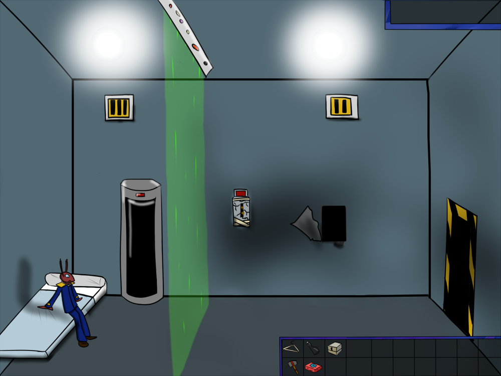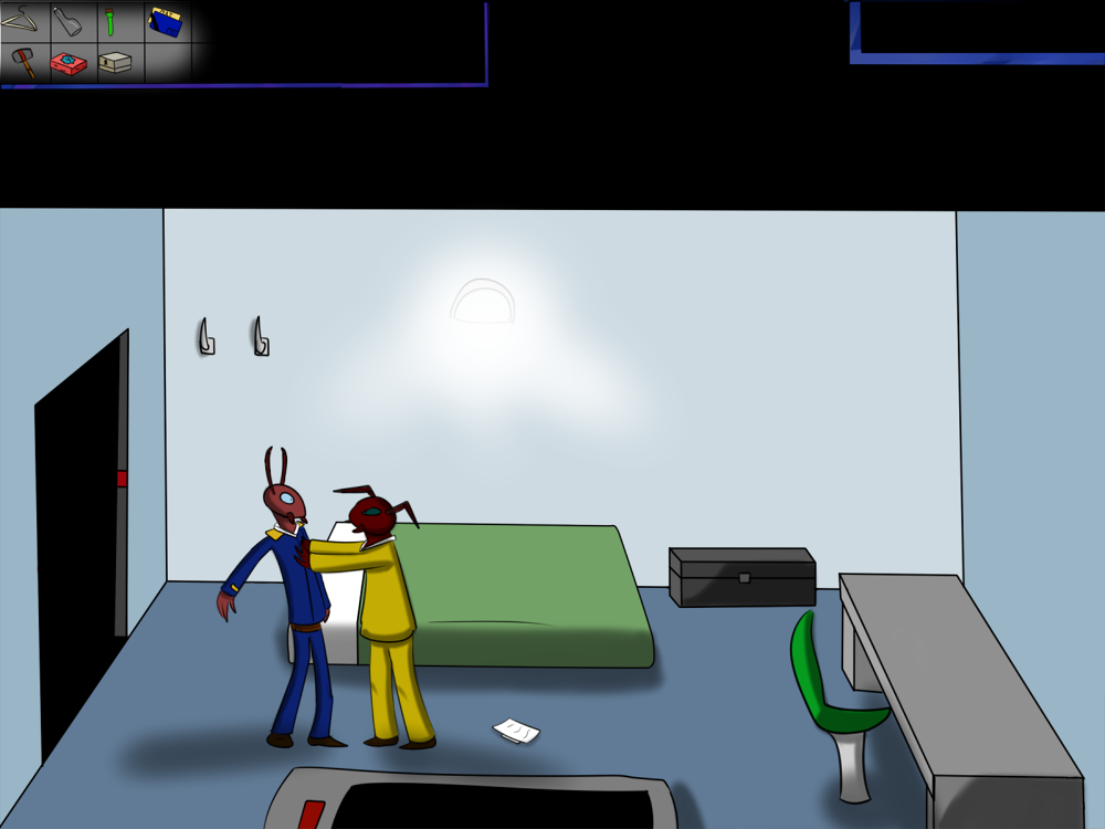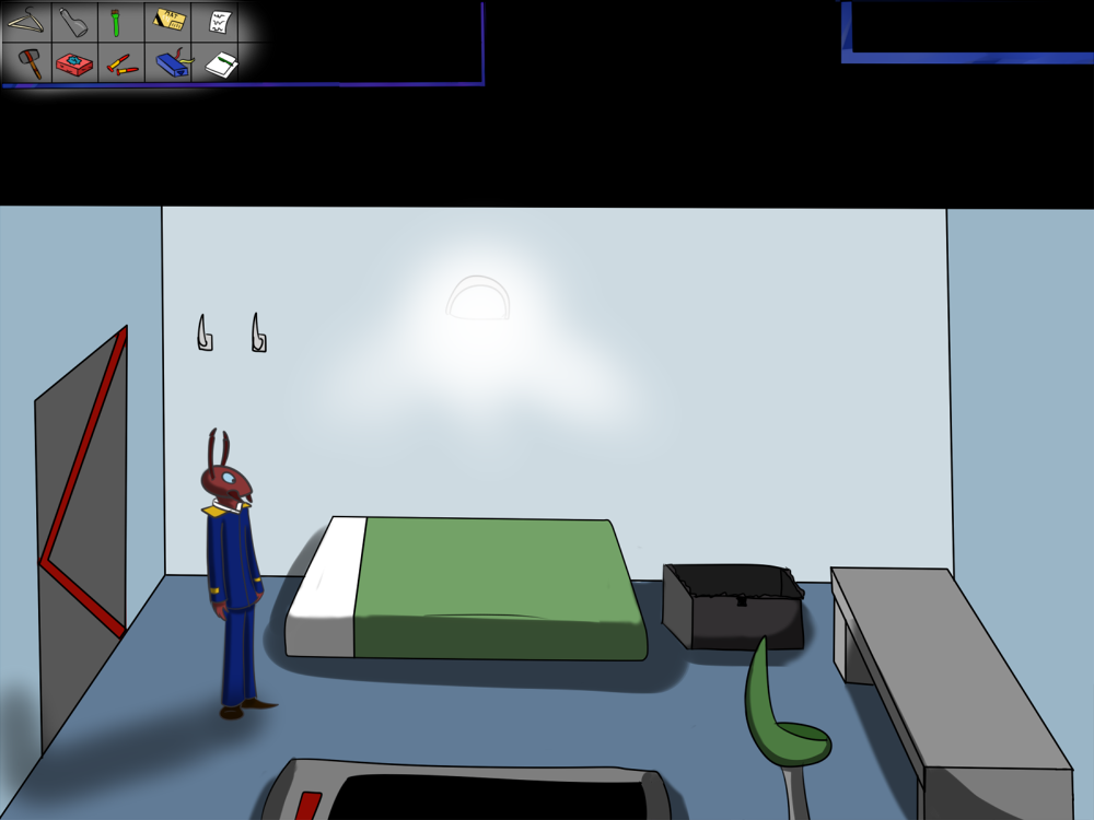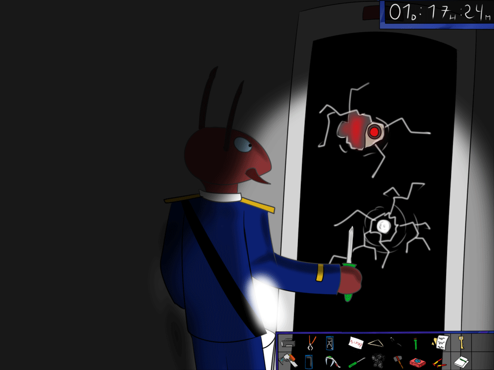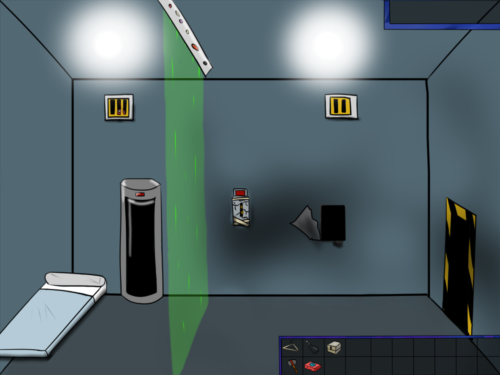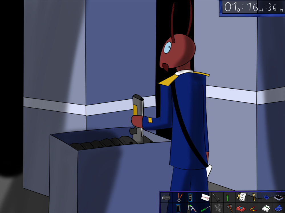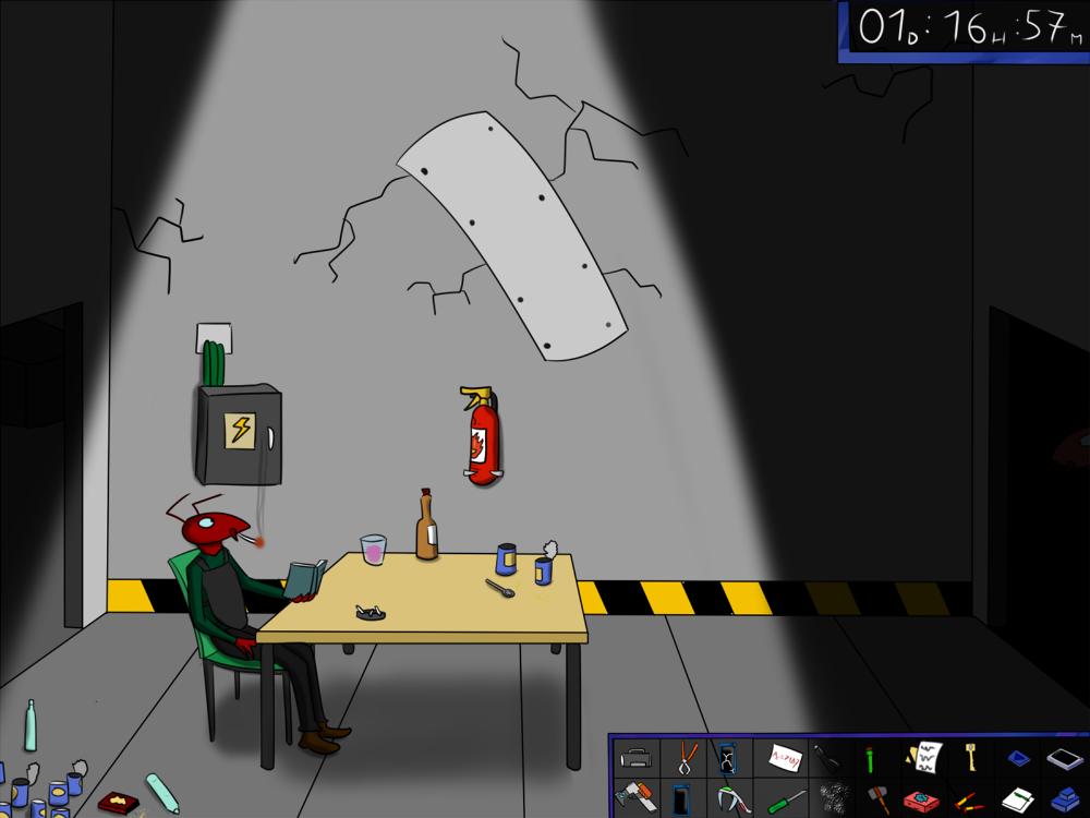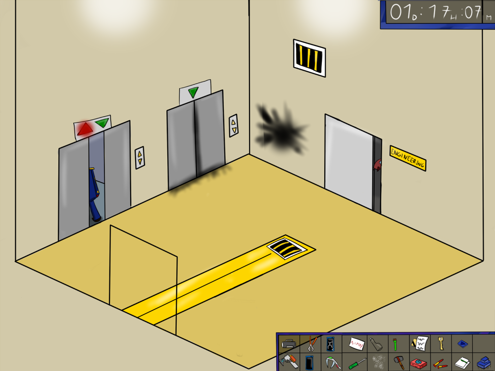 The last time, the janitor jammed the opening mechanism of the door with a piece of metal, then placed the bed behind so it couldn't be forced from outside. Tiak does the same, jamming the door with some random debris from the pile, but moving the bed would require pushing the corpse out, so he lets it be for now.