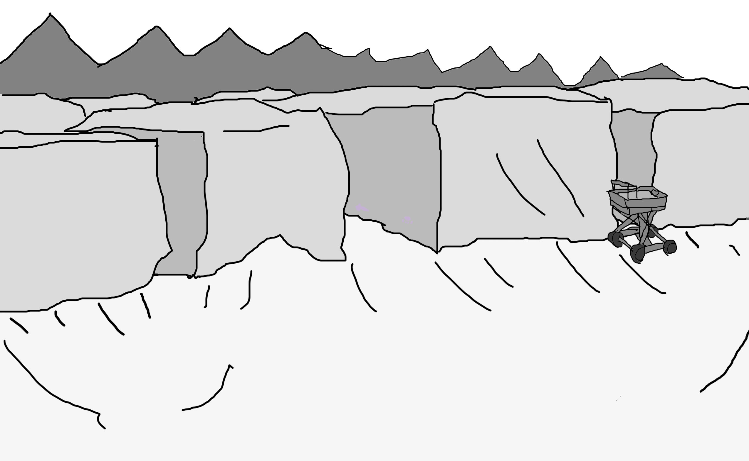 circle it once, get a look between the rocks. then get a scan of the water and plants t make sure it doesn't have any toxic things in it. then fill up canteens and get everyone some drinks.