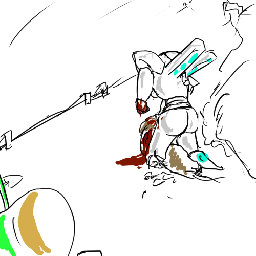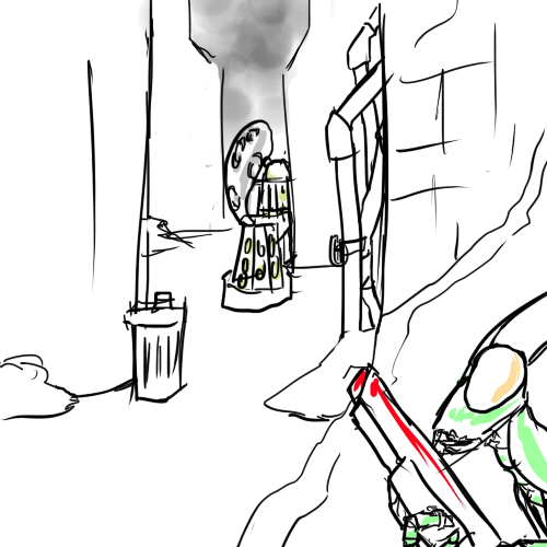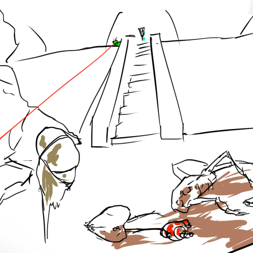 FUCK ME! I scuttle up the steps and into the big building. Its shots go horribly wild, but so do mine and I take a position behind this broken statute. The building is pretty huge and extends backwards. Looks like some kind of museum or some shit.