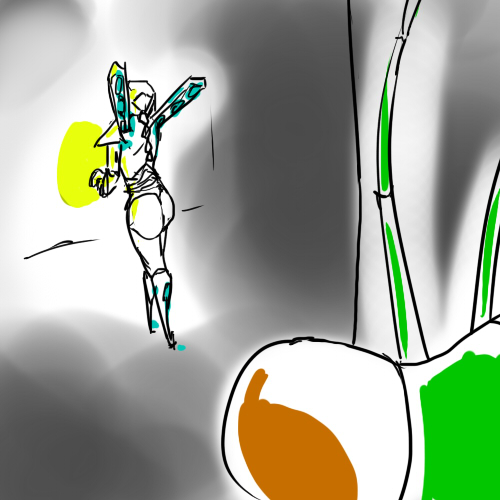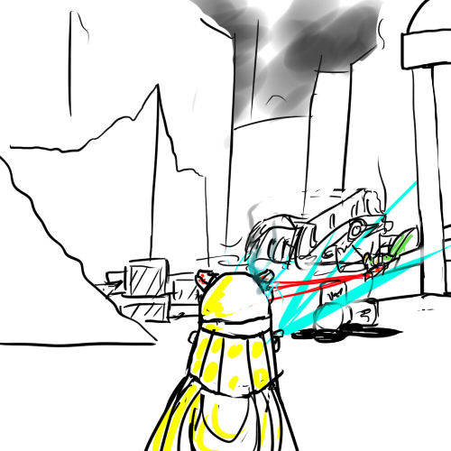 It's screeching something else now! "MY VISION IS IMPAIRED, I CANNOT SEE! MY VISION IS IMPAIRED! I CANNOT SEE" and firing erratically everywhere!
