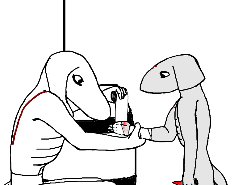 “I found some bandages, so we can get your wounds covered up,” I explain. “However, we first have to clean them, and all we have for that, is alcohol strong enough to strip paint.”