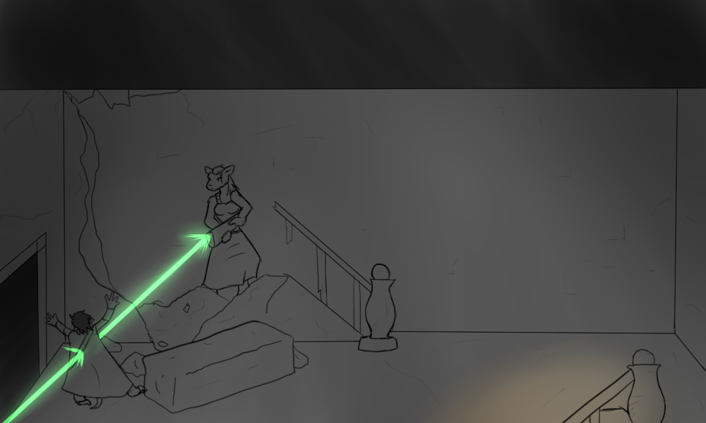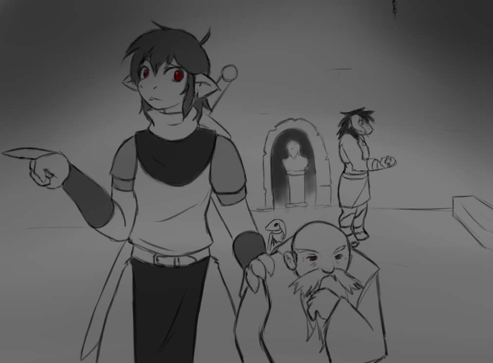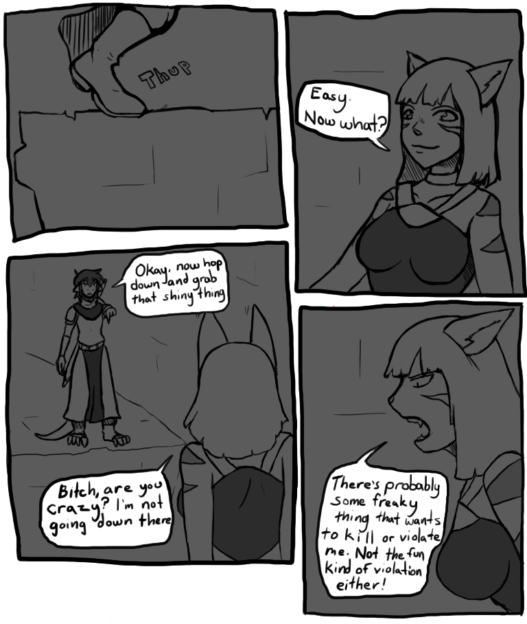 "Rynh, let's get out of the nice dead guy's way before he fries us with horrible death magic. I am way to hot to die here and being a zombie with a hot ass is not going to do anyone any good!"