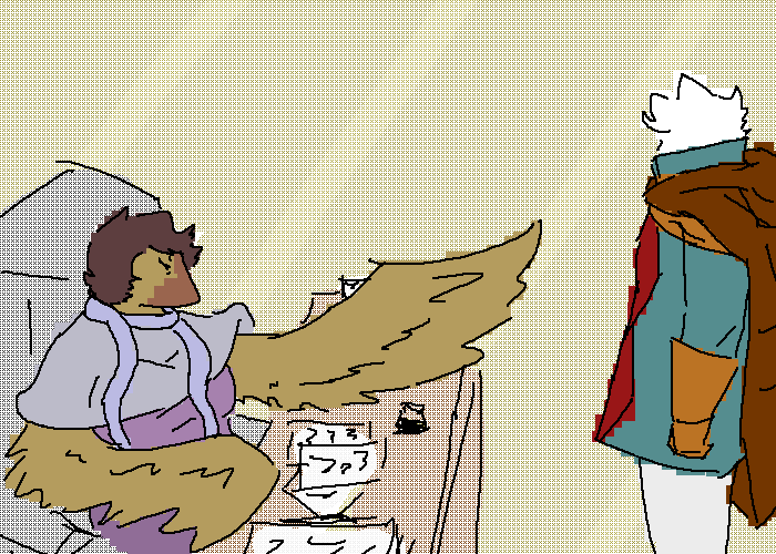 "Send in the next one," a woman announces through the crack in the doors. Marisa stands up and is ushered inside by the male guard, who, once they are both in the office, moves to stand vigil against a wall adorned with various maps and sea charts. Various trinkets, baubles and oddities decorate shelves. A globe sits in a corner, and a stand is set up with a book that is open to a page of what Marisa recognizes is printed in Runic. A massive shield of elaborate design is displayed high on the wall behind a desk piled with papers, at which a middle-aged avian settles into a padded chair and crosses her wings over her lap. As the woman looks her in the eye, Marisa can practically feel the woman's glare pierce into her head.