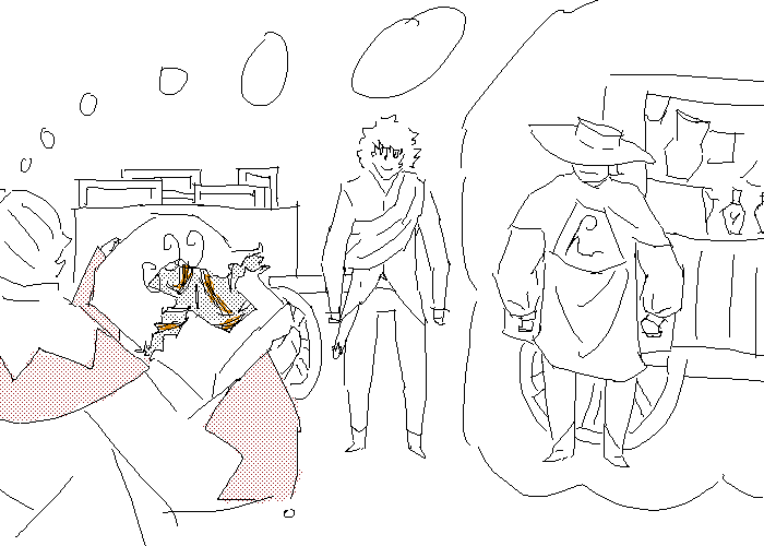These individuals, however, do not seem to be orthodox merchants, if they are even merchants; they do not speak the common language of the land, they dress peculiarly for merchants, and their carts do not seem designed to allow for the convenient display of goods for sale as most merchant carts do.