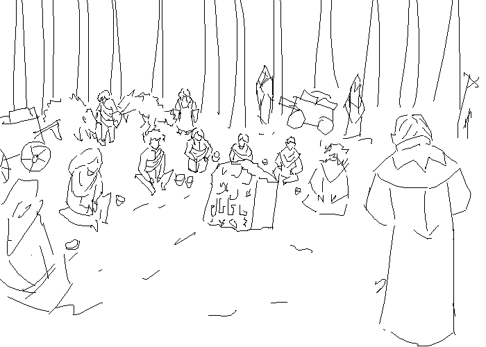 So as to remain polite, I wait for the others to finish their meals. As I sit quietly, I notice Egil leaning over to me and motioning for my discarded stew. Assuming that he is requesting it, I nod and hand the bowl to Egil; he takes it with graciousness and begins eating. It is not long until the Draebhunds have returned to the camp with their handlers and been given large cuts of raw meat to tear into. The rest of the group have finished their own meals and remain in their circle to trade words. I take this time to thank them for their hospitality and excuse myself as best as I can; I stand up and bow in the general direction of the group.