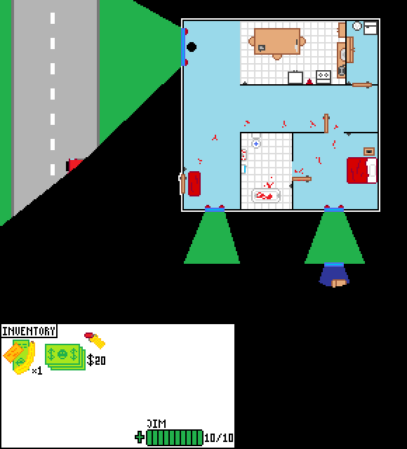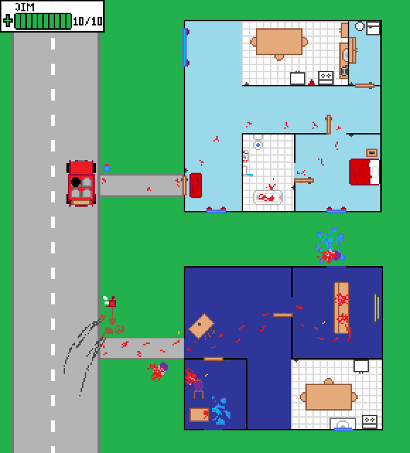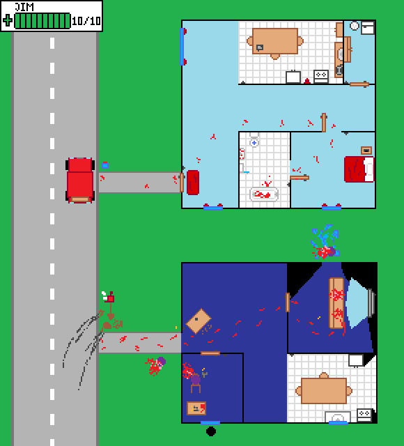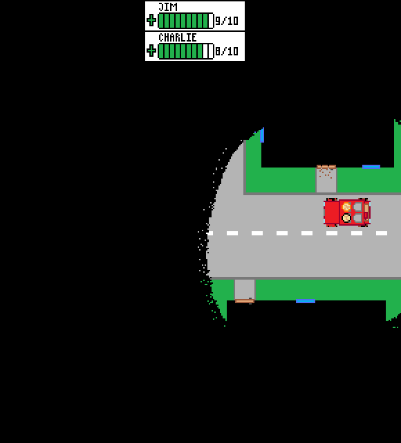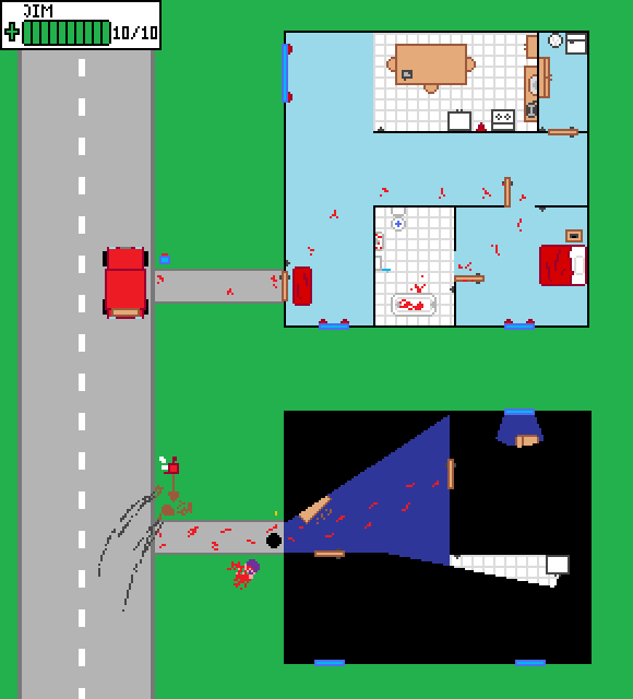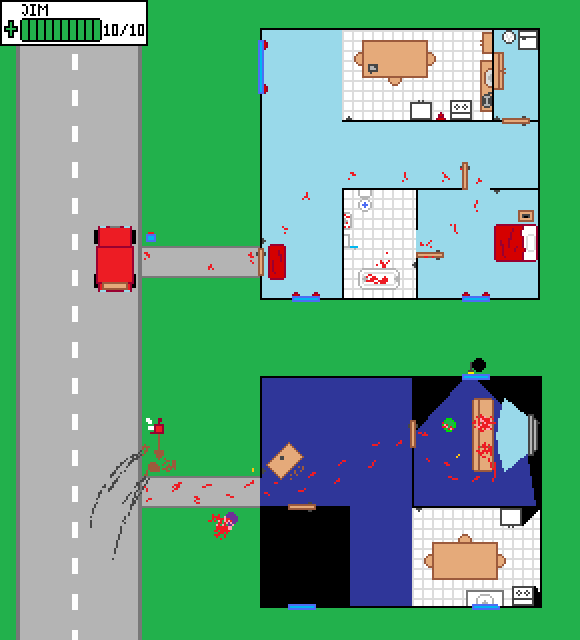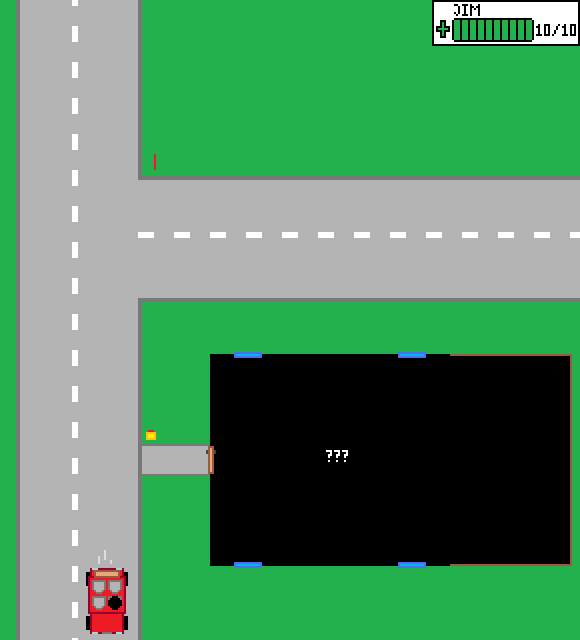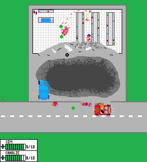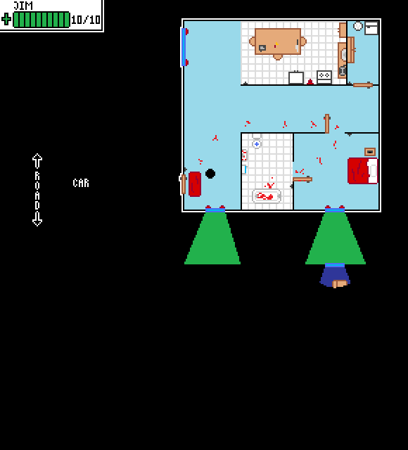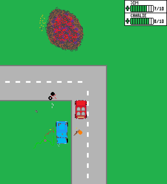 The car's engine is in pretty bad shape, and the car has already been looted fairly thoroughly, but Jim manages to salvage a length of rubber tube and a car battery from the wreck.