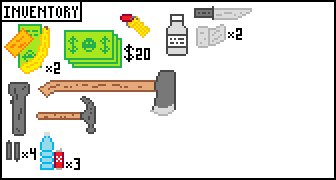 >hammer, knife, axe, painkillers(2/3), bandages x3,