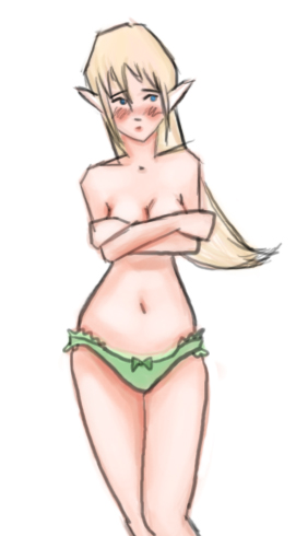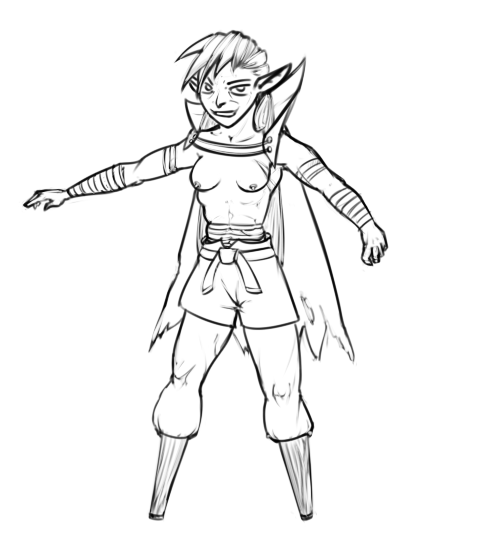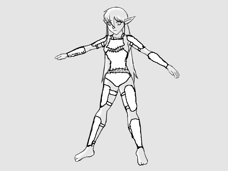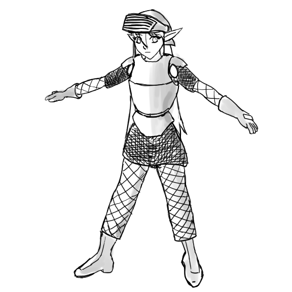 Well, miss Moonleaf, first keep in mind your priorities. As an adventurer, one of your chief concerns is not getting killed. To that end, you want garments which can afford you protection while minimalizing any restriction to your movement. From the slightness of your frame, I'd say that metal is out of the question. That brings us to boiled leather. Attached is an appropriate design, which I feel maximizes protection without hindering joint movement. There is some small hindrance to trunk torsion, and bending over backwards may be physically somewhat awkward, but I believe my slitted corset design minimizes these downsides.