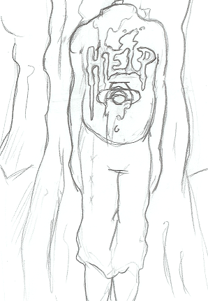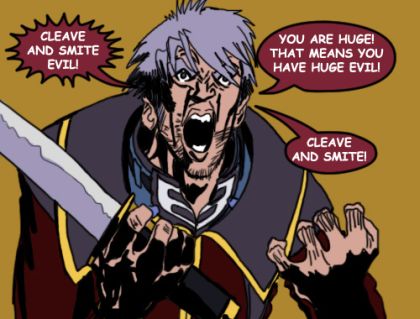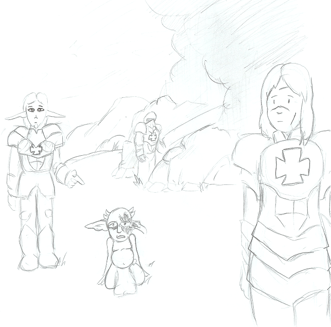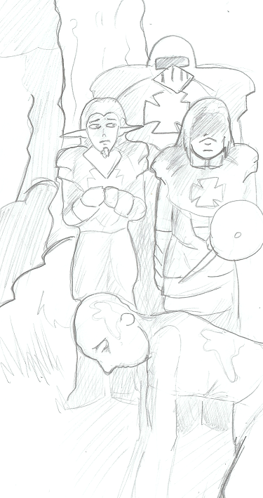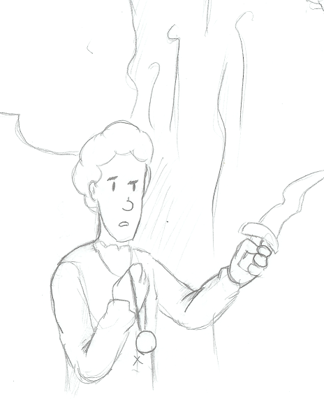 >It’s all been downhill from there. He fled his village, bloodied sword, until a town caught him and, when he refused to explain why his sword was bloodied, stuck him in the stocks for the paladins. Only after he was released did he realize that the town has threatened to allow the Paladins to kill him, and my terms forced him to slaughter them all. As he fled the town once more, he came face to face with a would-be bandit who he promptly decapitated and dragged through the woods, hoping someone would find the trail and… help him.