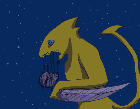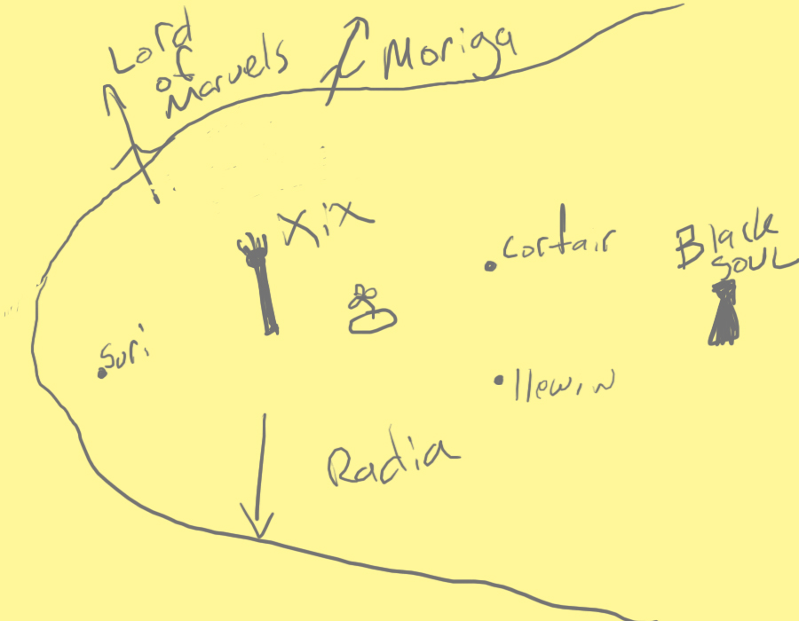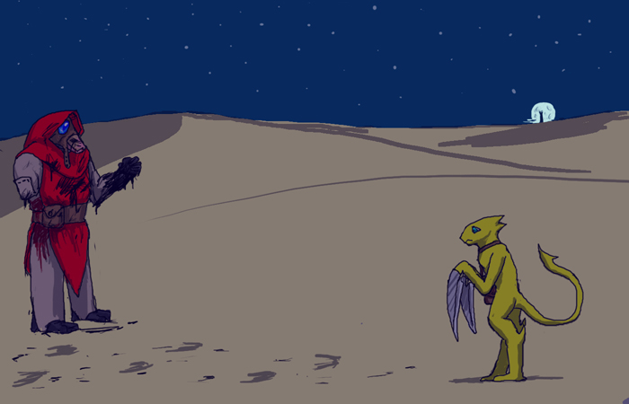 "I gave my arm to Lord Ryxix, you know. I am his adept. I've used his own power to murder his minions. This, this is truly a great offense against the starts. Fate bears down on us like a tidal wave, ready to sweep us to oblivion. How long can we struggle against it before we finally die our pitiful, worthless deaths? My name is Heartsbane, by the way, and this is Llewin."