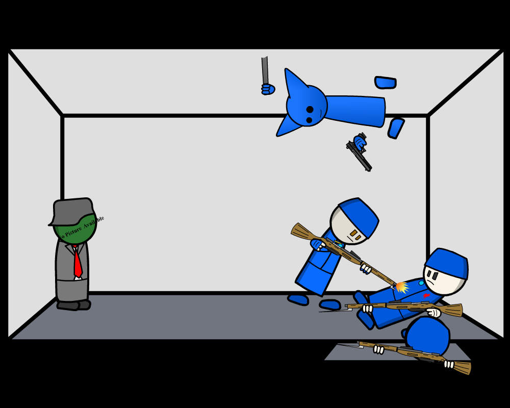 Part of the ceiling suddenly shimmers and a BlueFigure shoots the other Soldier (10) in the head for 14 Damage dropping him.