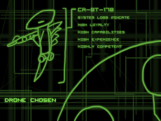 Now, I wish for this to be test of loyalty, not competence. That I reserve the right to challenge you about at another time. So, I am going to supply you with more resources than you might be expecting. You will be provided with a boon, as will your drone. You, subsystem group TG-CN, have the option of the following: - Two (2) requests of whatever information you desire during the course of the mission, subject to availability of information. - One (1) request for back-up from known high-loyalty combat drones. They will return to their missions once they have provided sufficient assistance. Advanced heuristics will be used to determine when you wish to use this after a consensus has been made, weighted on immediacy of the situation, suitability of the request, and my totally flawless decision-making processes.