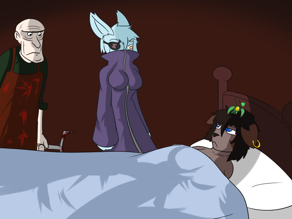 “Ahem! As I was going to say... Your recovery is astonishing, captain. You’ve got two holes the size of a ChickenChoke* ball in your hips. Don’t know what made them, but they should’ve pulverized bones and organs in their way out. That added to the massive blood loss, should’ve been enough to do you over. But instead, you’ve only got but mild hip fractures. If we find a competent flesh wizard, you’ll be up in no time.