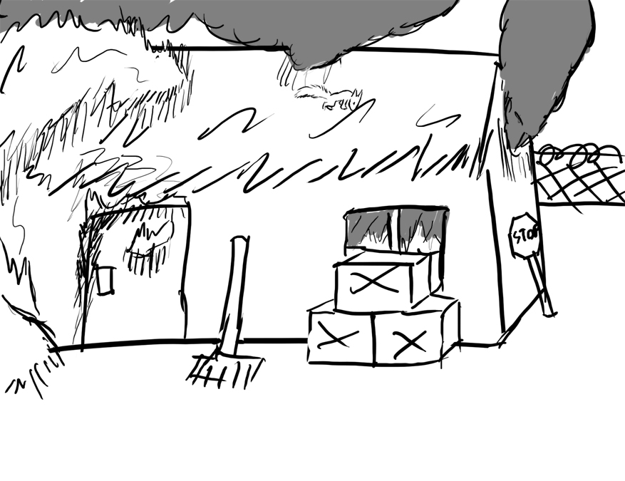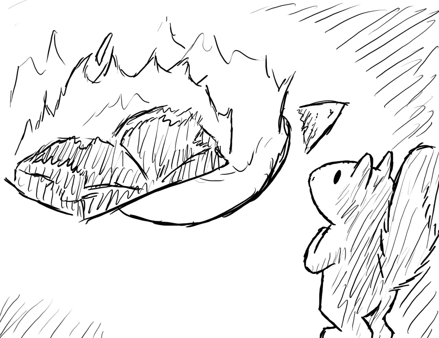 GIANT is sucking on glass thing? he smelly. there is big FIRE.