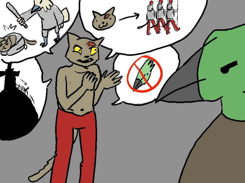 "Someone has to pay for what they did to Waihlin? Really Ik? IS that what Waihlin or your parents taught you, that when misjustice is done, someone, ANY one, has to pay? I am not some sadistic peepin' fuck, unlike you. I do not want that memory, slicing someone's head off, in my mind. I have no clue of this cat man's direct involvement. He can't tell his side with the language barrier. He might just be some dumbass teenager that was just following his scumbag father around with his tribe as they took people captive and got left behind, or he could really be a slave wrangler, who the peep knows. Whatever, I am not going to be ANYTHING like them and stick some stranger's head on a pike out of some pathetic desire for vengeance. That is NOT how us peeps are. Ik, do you even comprehend what that is? Life is to be RESPECTED, no matter what happens."