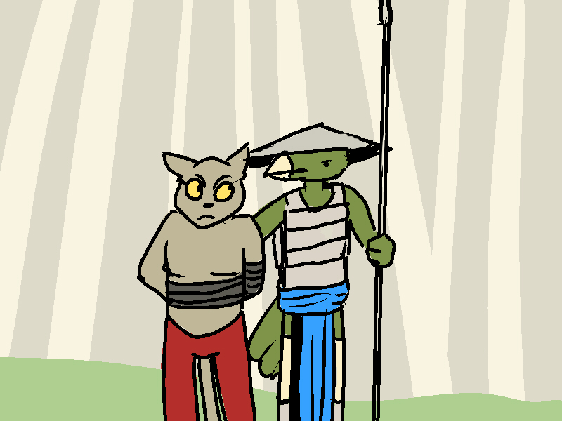 STRANGE MAN explains in very broken Augernian (a southern dialect that Ik is only vaguely familiar with) that he is lost and he was left behind by his soldier friends. He uses mostly gestures and his own language. He says that the "big bird" beat him too much. Ik thinks that he means Lopsan the Miller. He ran away from the mill and hid in the ruins.