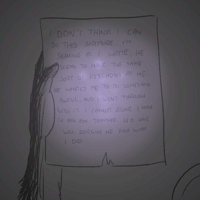 Right. She was ignorant. There was no way she could've known about it. She did not even think such a terrible thing would have happened if she just let curiosity get the best of her and just had a little glimpse. Rina is suddenly angry - angry at Mr. Farrow for all this. Then again Harry could be a lying scumbag psycho, but somehow his words...they sounded so genuine to her. It all made sense, clashing with her memories, although there is still a lot to be learned. Rina just knows it.