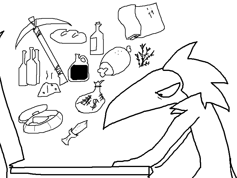 Numerous food items, including a loaf of fresh bread, a raw leg of meat, several bottles of beer (empty), a bottle of Minotaur's milk, and a fist-sized piece of pungent aged cheese.