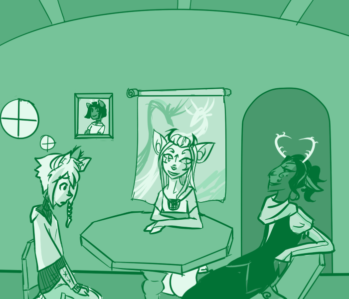 The young deerling suddenly breaks off when fi notices the guests in fir sitting room. "Oh. Hi. Are you relatives?"