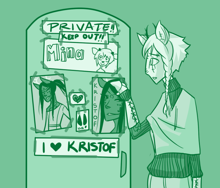 A moment later, the door swings open. "Tag, Frohrer! You won't believe what Gretel said to me today, ti was like 'I bet you're not even a Rekitzchen, you're some kind of freaky hybrid,' - well, okay, that's not EXACTLY what ti said but that's BASICALLY what ti said - and I didn't tell the teacher because like I didn't want to start anything and only deerlets tattle but I got so mad, because like it's not my fault that -"