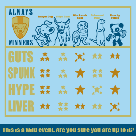 ”Yes, we totally agree but we have no idea what the Always Winners have up their sleeve. I guess we'll have to wait and see how the second round goes here. With Yiff Yaff going to the Whine Tasters, Boner Dragon easing into the Hug Box, and Jerkbox 343 rudely gesturing at Two Hassle, the last three rounds could be qualify who has an extreme advantage folks. We'll be back with you for round 2 soon! We're Twice Moose...