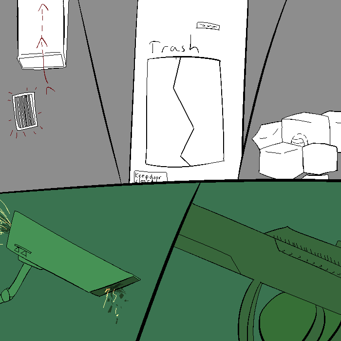 With the cameras disabled, I will be able to hop into the vents, but they are covered with grates. They do not look heavy duty, but it will be a clear giveaway to my entry. I will also be able to take a trash chute, but don't know where it will take me. Alternatively, I can hide behind some boxes to take a closer look at my immenent adversaries, but it may be difficult to hide from them for long.