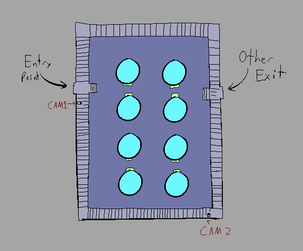 That means a fight is out of the question. Even assuming you can quickly beat these guys 4 on 1, what are the odds you can guarantee non-lethal injures to the whole squad during the firefight? So you need to bug out. We need an escape route, one that preferably gets you off camera. Vents, or the garbage shoot, maybe.