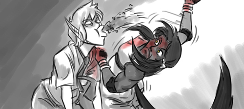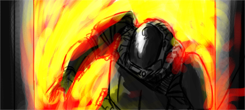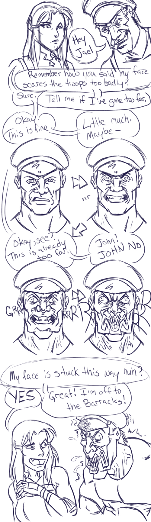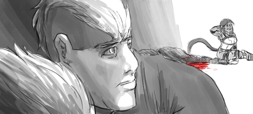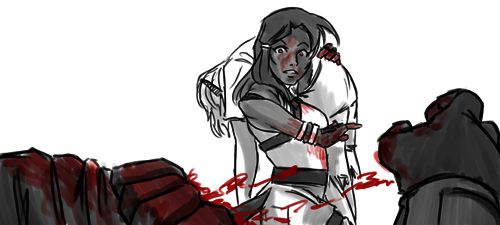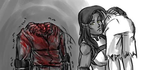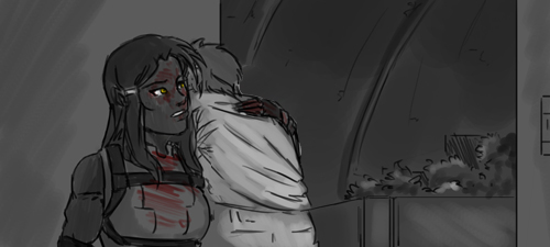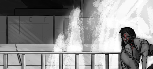Suggestions during this brief part of the story ensured Jael had a difficult fight. However, her actions were fast enough to prevent complications later on with the other soldier, who would have been an even bigger problem. Her reaction to run from the "zombie" set up a part of her own backstory. Suggestions to fight the supposed corpse would have stalled her reaction and resulted in a short scene later, on the elevator, as she reflected on it. The vomit scene is all you guys. Jael shows empathy with Ram, carried over from earlier interactions. She could have ignored his injuries and separated from Ram for the time being. Ram would have passed out in several variations of this part's end, depending on what Jael does and how much she interacted with him.
