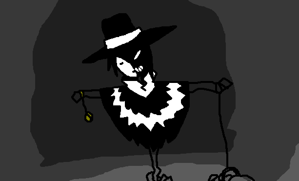 A long time ago, here on the planet yokoko, there was water everywhere. The planet had many assortment of plants and animals, and there were many peoples that had colonized, civilized, and albeit existed. One day a group of Grey Mage businessmen came to the planet and offered there wares to the local peoples. Sadly the businessmen did not take any of our currency, instead they would take the yokoko peoples as barter material. At this time there was a sort of hierarchy system in place and the slaves and peasants were sold for these alien trinkets. But eventually both slaves and peasants started to dwindle. The businessmen had camps here which they took all the owned property, and year after year they would get raided in order to take the slaves back- but only to resell them again. From paranoid tellings, though, we believed that the Grey Mage people became angry. We were not aware that they were slowly making the planet hotter, and even hotter til all the water started to dry up. By the time the weaker of the Yokoko people died from the heat they were beginning to refuse the alien devices... but it was still all too late, for it became hotter still. The last remaining peoples either left our planet using the arks the aliens sold or joined the soldiers that gathered for an uprising against the businessman. This cave behind me was the homebase of eight specialized goblin soldiers, all of which were well blessed shaman. On the night before they were to join the main army, they raised a scarecrow in that cave and prayed to the spirit of shadows to take their request. They made their offereings and while they were in their ritual one of the Grey Mage metal golems slaughtered all of them. The history of the "shadow man" comes from that very scarecrow drinking up the dead mens blood, gaining flesh from the darkness of the cave, and with the offerings he accepted proceeded to help the yokoko people evict the Grey Mage people off of the planet. It is said that if you make an offering to the shadow man he will do a single task, a task which can even shake the impossible.