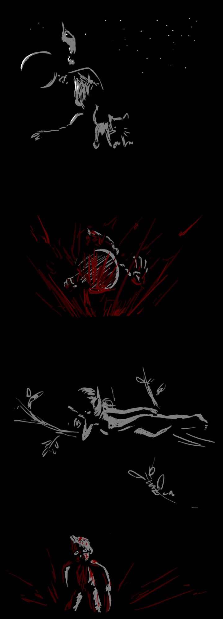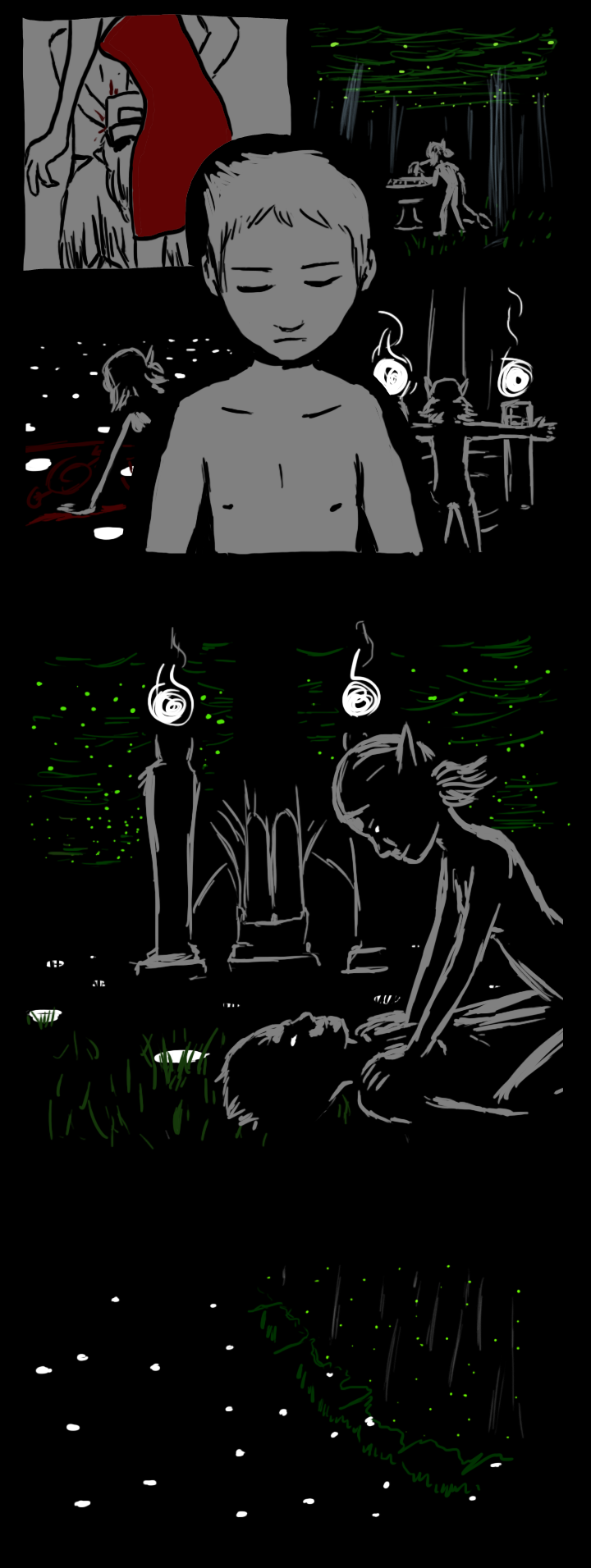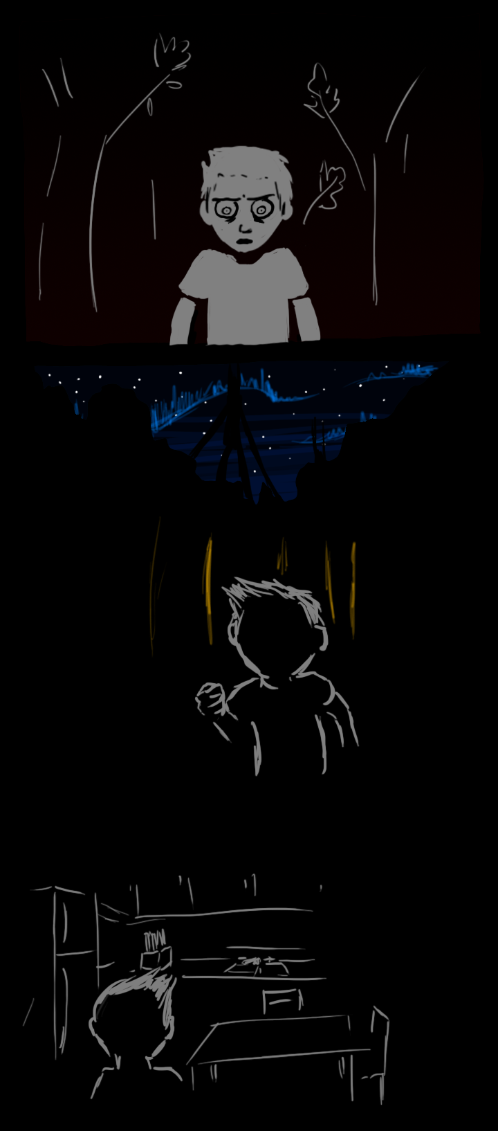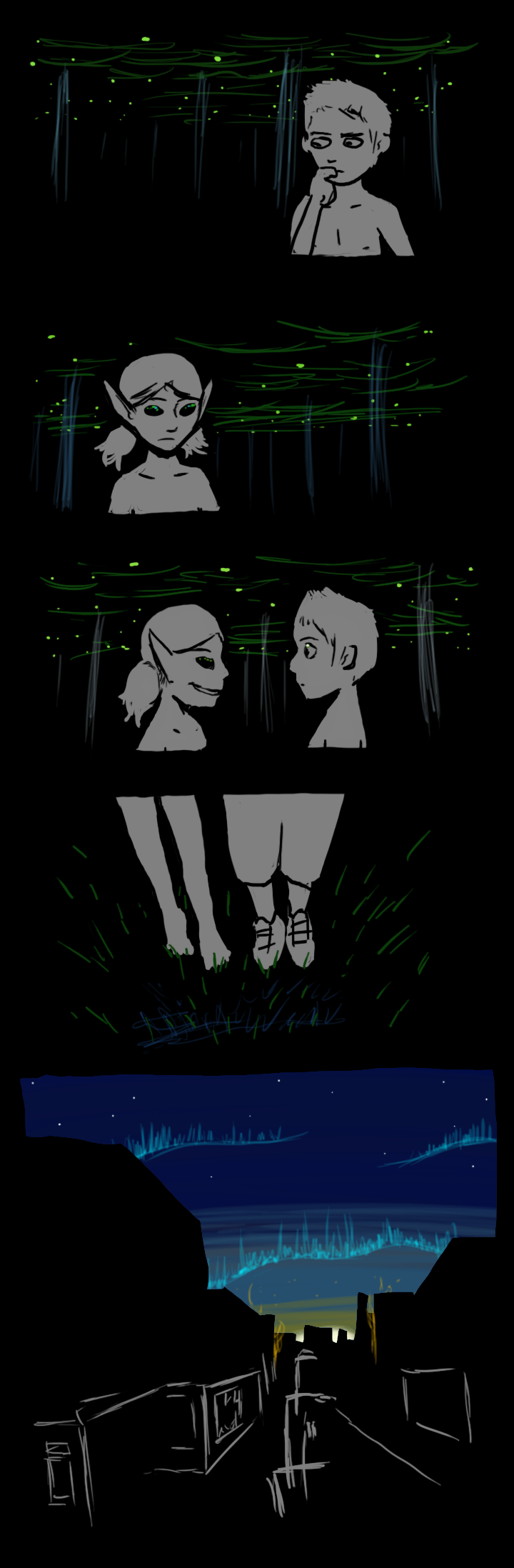 The two of you step over a patch of moonlight. The smell of smoke fills your nostrils. Overhead, the shimmering blue streaks waltz slowly across the sky. The sun is just beginning to rise over the city, which, you notice suddenly, is completely dark, save for a fire clearly visible a few blocks away. You don't hear any sirens. In fact, you don't hear much of anything besides the dull impact of your shoes on asphalt.