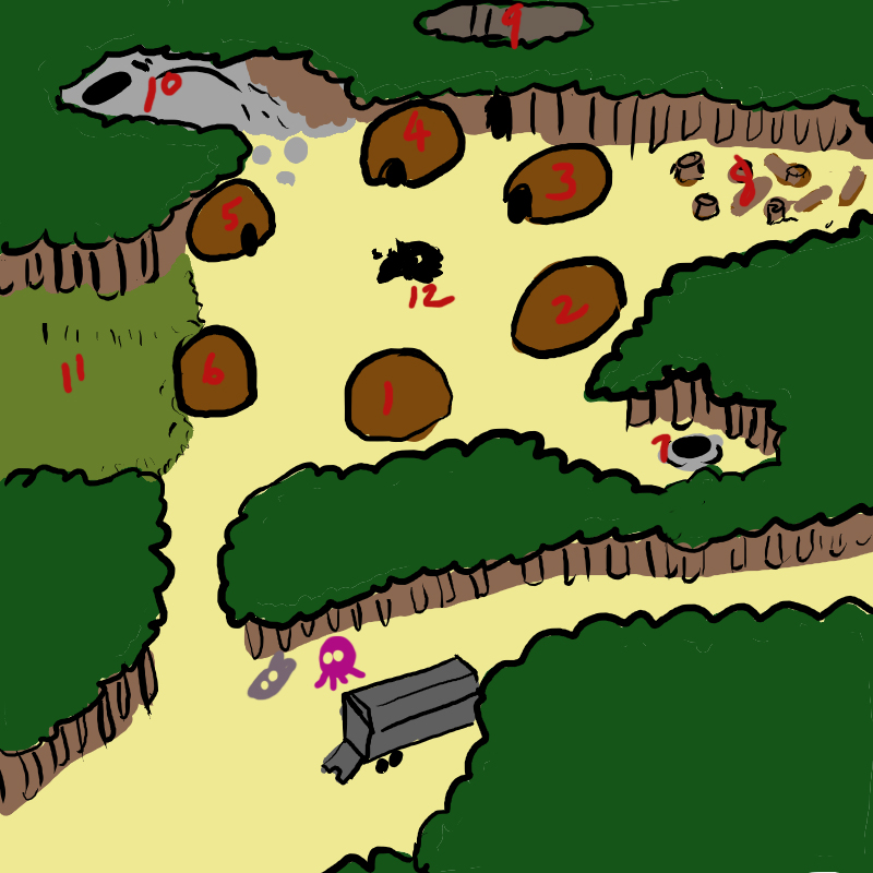 Now, where should I go check for them? The village has six houses, there's a well, a logged area, a clearing, a cave, a grassy area, and a fire pit.