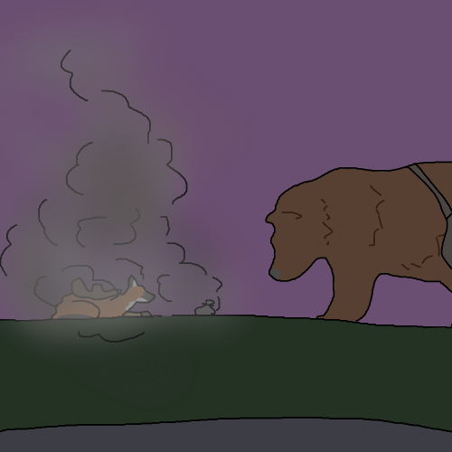 The sudden appearance of smoke on the lake-edge, a tiny pocket of twilight fog, makes the bear stop. She shifts her massive head up, sniffing. You know she can’t possibly pick out your scent from among the cloud.