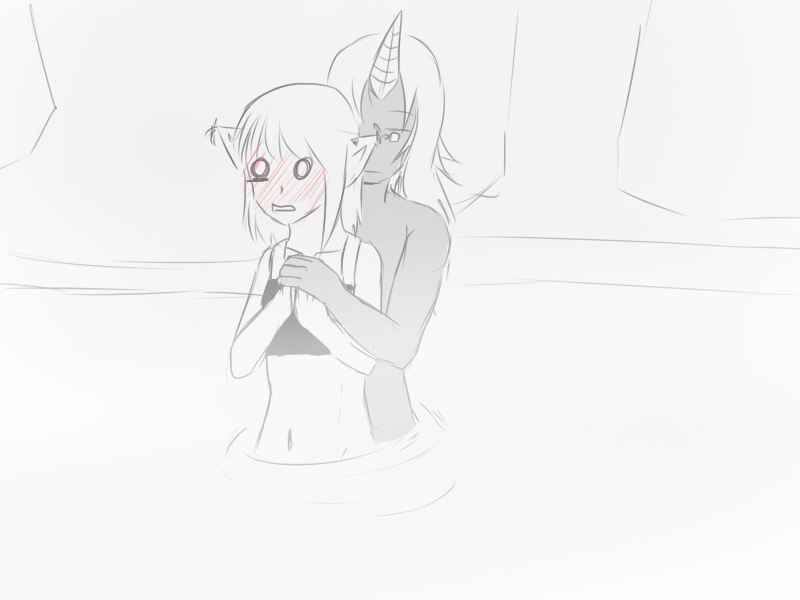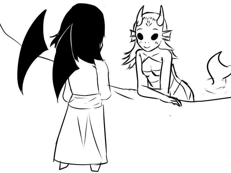 At her call the Dragon of Water pops out of the pond in the middle of her cave. She's in her merfolk form right now and when she sees Ombra she gives a squeal of delight and smiles at her