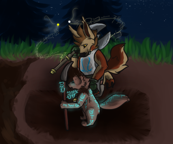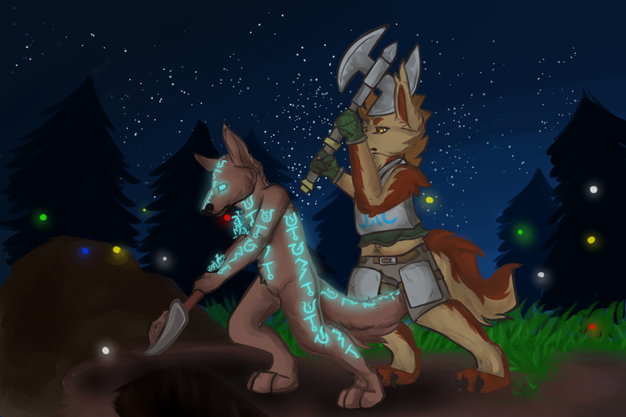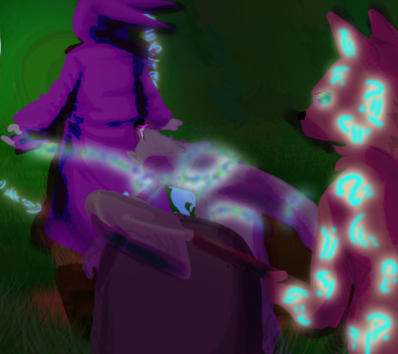 ... I haven't seen magic like this before. I didn't even think this kind of thing was around anymore. I mean, I remember learning a half a dozen centuries ago the canines could do stuff like this, but now they pretty hate all magic all the time and execute people who do it. The brown one there doesn't seem to mind though, he's glowing with the stuff, and I think he has a magical arm replacement? It's kinda creepy...