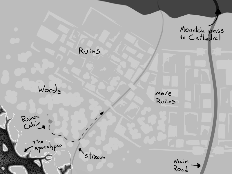 You have to get up to the lands, but that’s still quite a ways away, especially if you try to avoid the ruins on the way there. The end of the world is at your back, and you don’t have any reason to believe it’s going to stop before it overtakes the bold’s house. The thing that attacked you is still out there somewhere, and you don’t have much confidence in your ability to survive another fight with it. You were trained to fight men, not monsters.