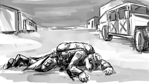 With the situation secure, you rush to the aid of the stricken trooper, taking off your borrowed belt and tying a tourniquet above his wound. Dr Slate hurries over, tells you where to put pressure and makes sure that your amateur first-aid doesn't do more damage.