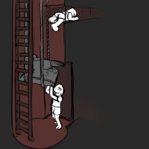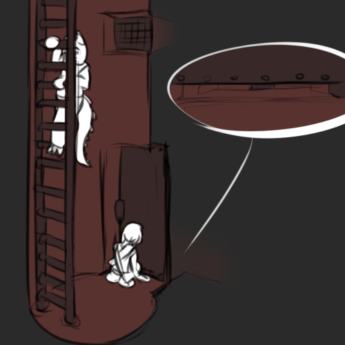 Interesting. I grab him, hand over his mouth, and take him to the ladder shaft. The others clean up our tracks in the canteen before joining us. The shaft isn't too big, I switch to one of Zenith's knives for threatening.