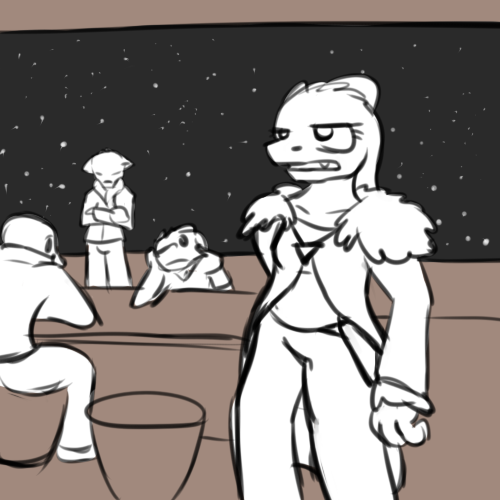 >"Oh, well then there's the 'security' guy, another Daro. He's also an asshole. He's probably just here as someone higher up to tell us what to do. He's got his own ship, he just uses it to pick up supplies from passing ships. The pilots are some human guy and some silth chick. I don't know much about them, pilots never talk much."