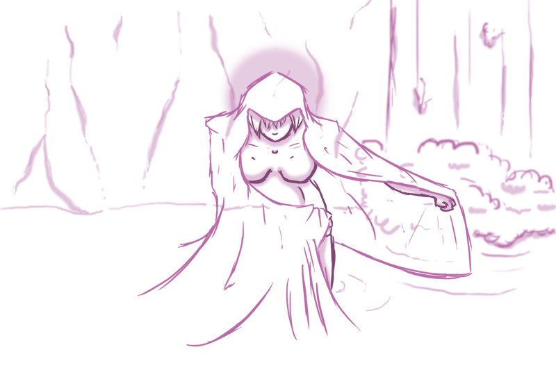 >You arrive in Rolands dream, cool mist fills the air as you are greeted by a white skinned woman wearing a cloak of water. Roland stands behind you, leaned against the back wall of the cavern arms crossed, garbed in golden armor and holding his sword firmly.