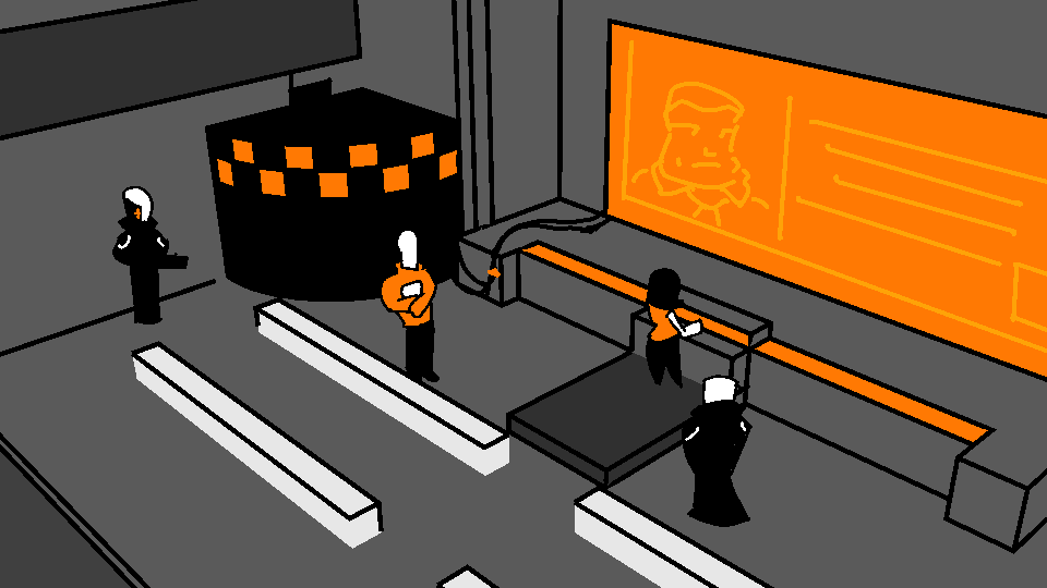 "I guess you do," Monica says. "You can use this room. Come one, 63. 94." She leads the guard and her assistant out of the room. "Don't fuck up, 73-6. OK?"