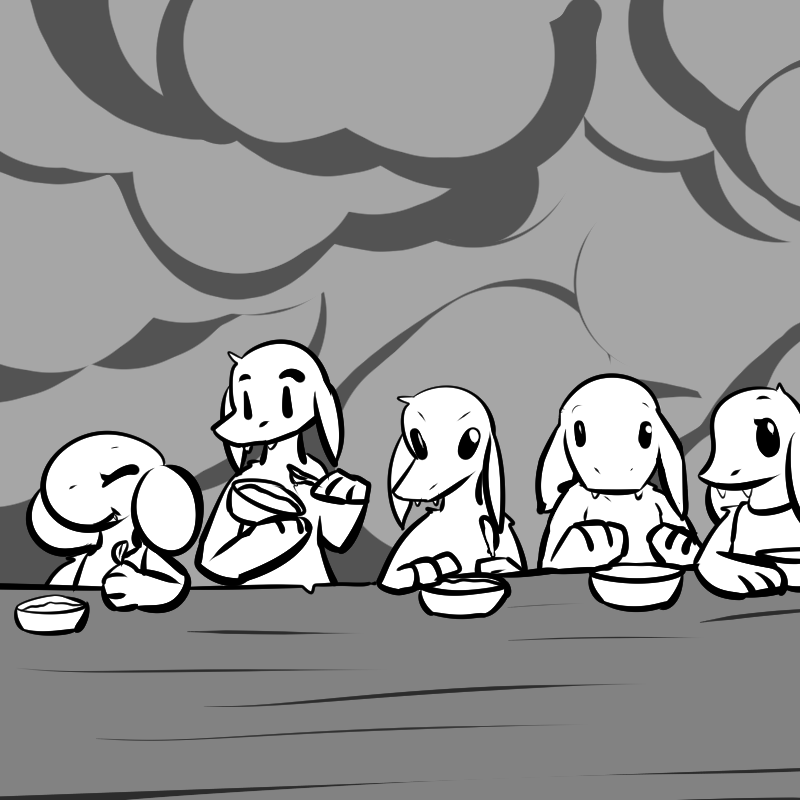 >"... okay, maybe he's asleep. And yes. Yes, I would like to doom us to some kind of painful, probably coal-related fate. Still, there's gotta be other people here. This place is always trashed at the end of the day, and everyone leaves, but when we come back? Spotless."