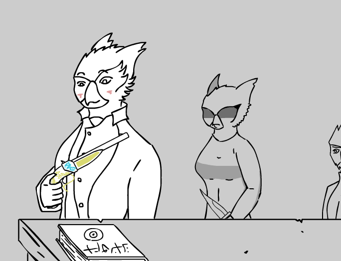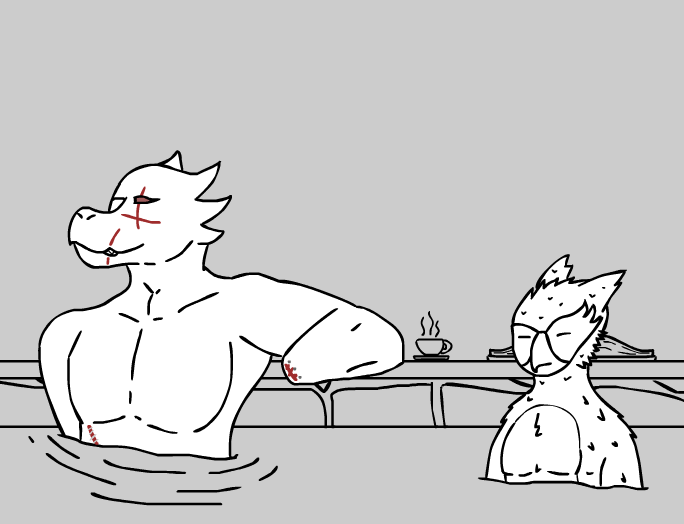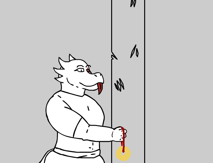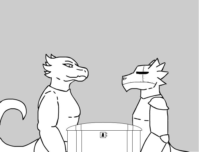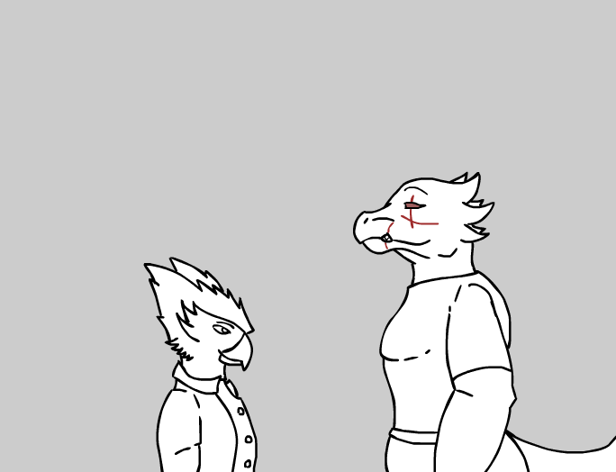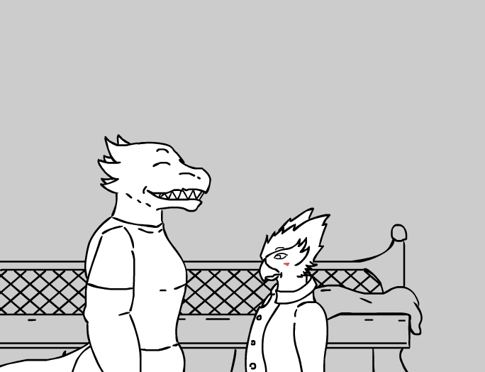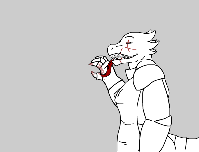 Oh, no, you quite like it when she smiles. It's when it goes beyond a smile into a toothy grin that it reminds you of... Of the recurring nightmare you have of that horrible day twenty years ago. Of the part when the carriage door is wrenched open and a grinning female Sakkilian leans in, p-pointing a h-halberd at your m-mother's chest for an eternal agonizing moment before... B-before driving it in... ...You know eventually you'll get used to Briannah's grin and it'll remind you of her and not the nightmare, but here and now it does.