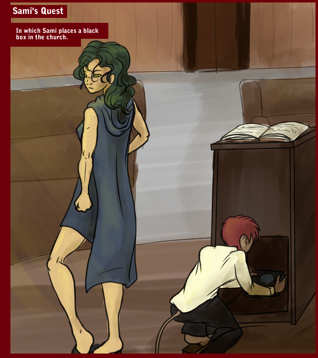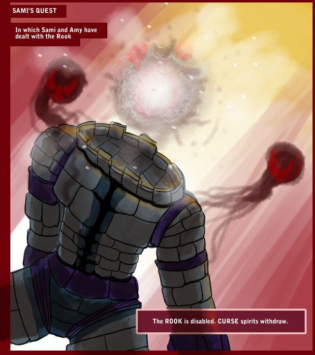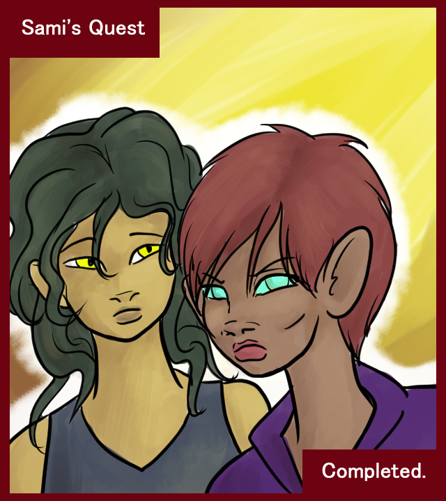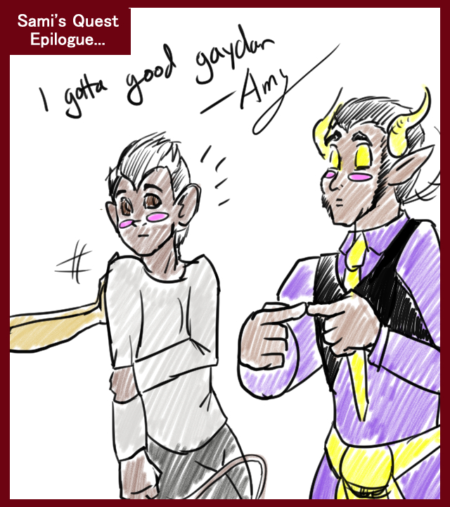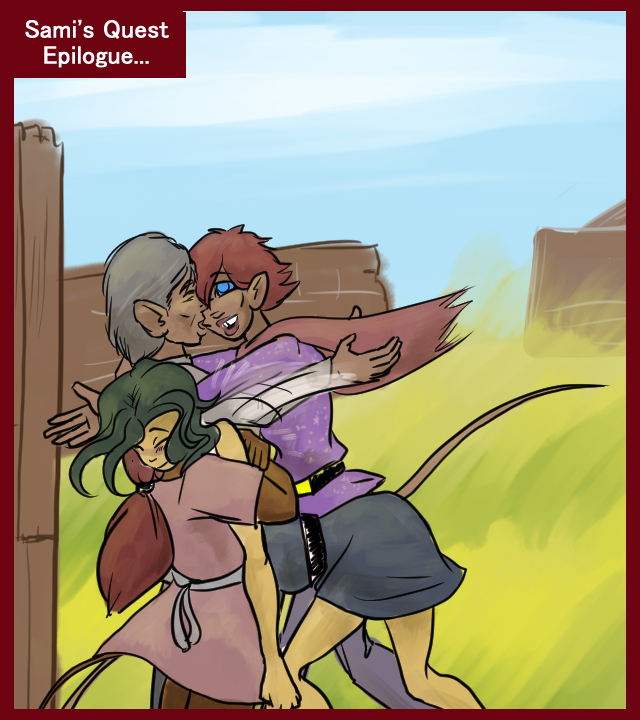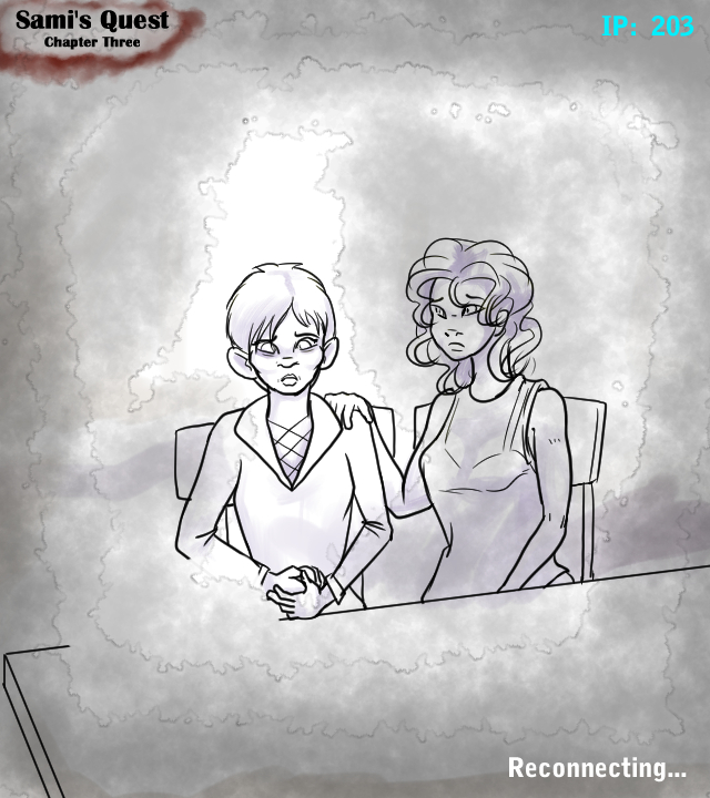 Sami goes over her adventures and meeting with Amy and her family, as well as the former mayor's involvement, the lifting of the curse and finally of the slow restoration to their former home town. Finally, she and Amy exchange glances and are quiet for a bit. During their silence, Sami's dad starts going into the details of the party they want to have to welcome their daughter home. They patiently wait for him to finish, but Sami's mom interrupts him.