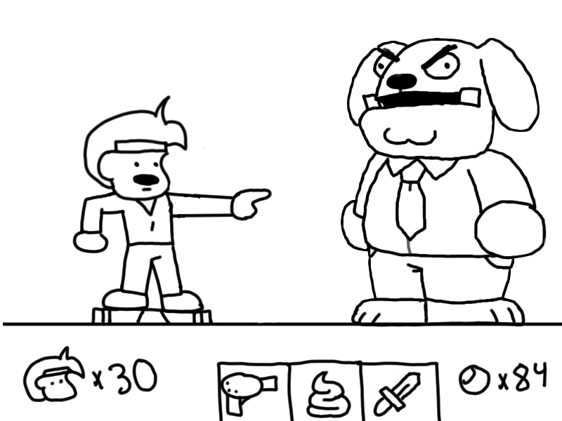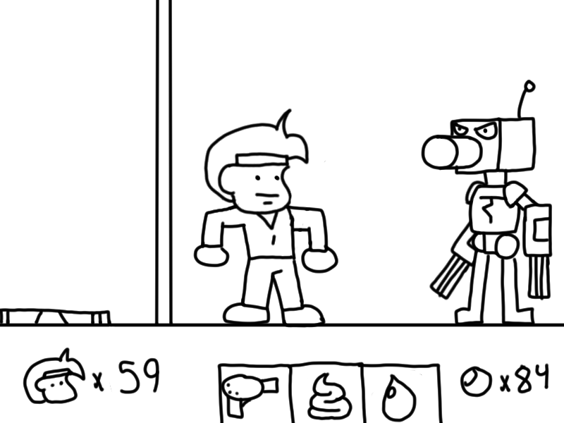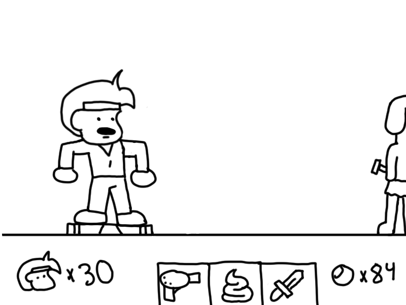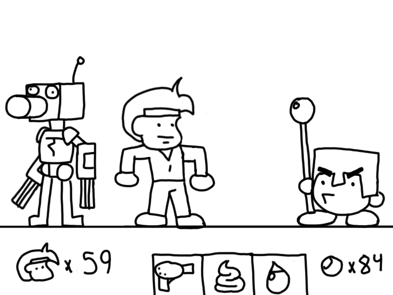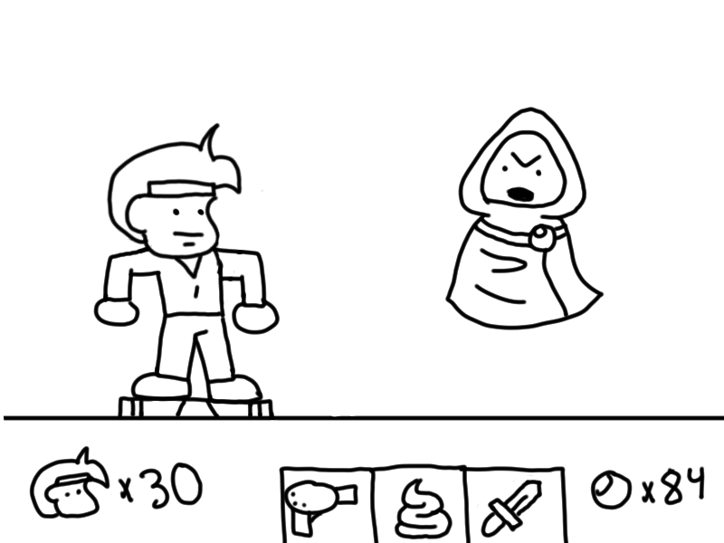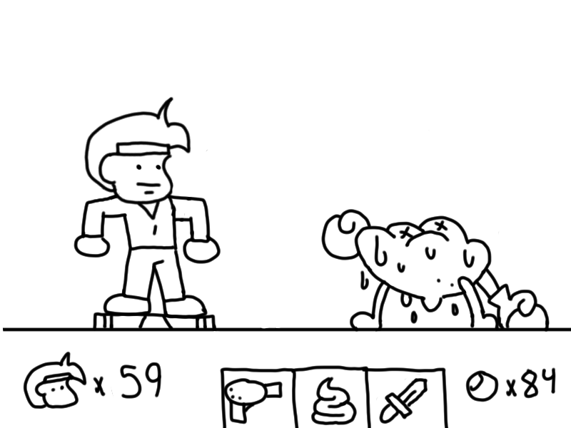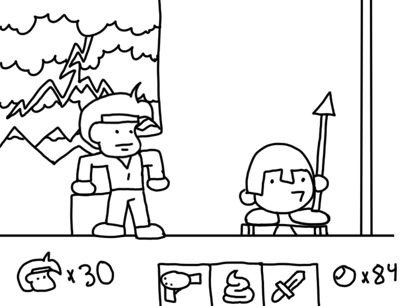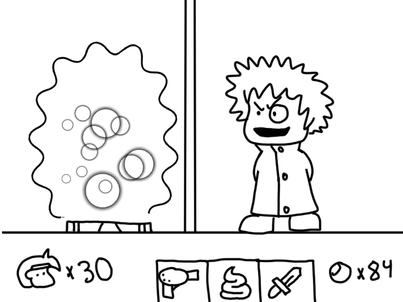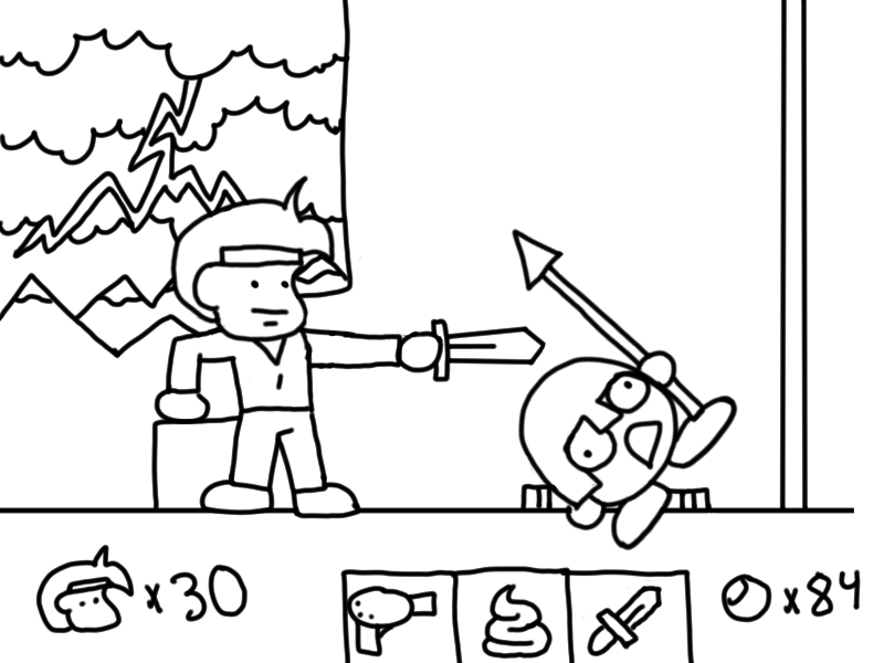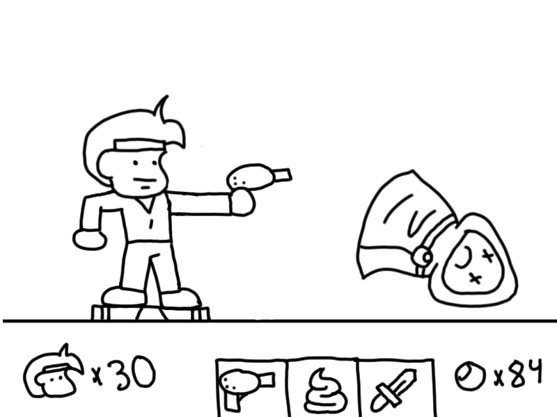 You are EQUIPPED with your trusty POTATO GUN, a POO, and the SWORD OF DROWS.