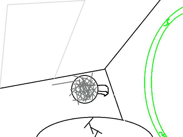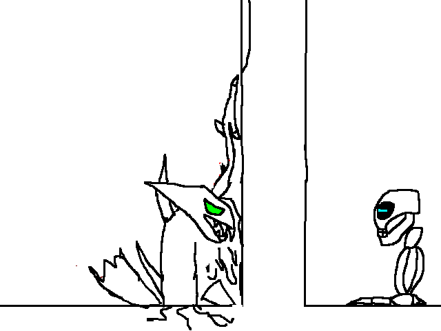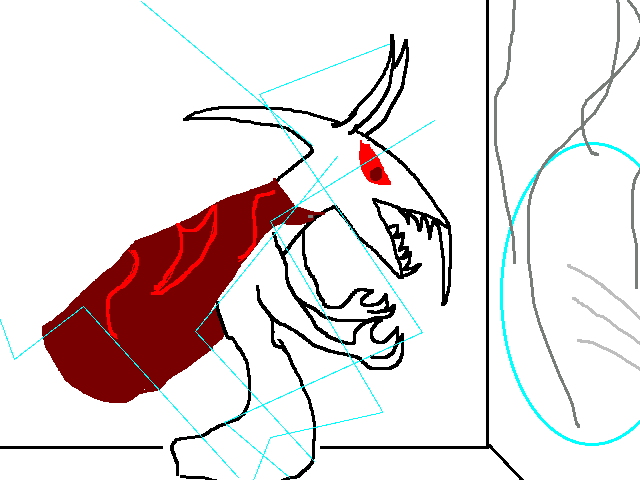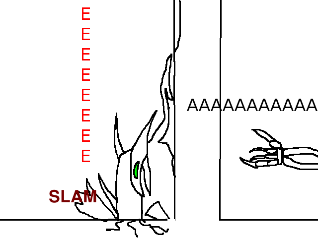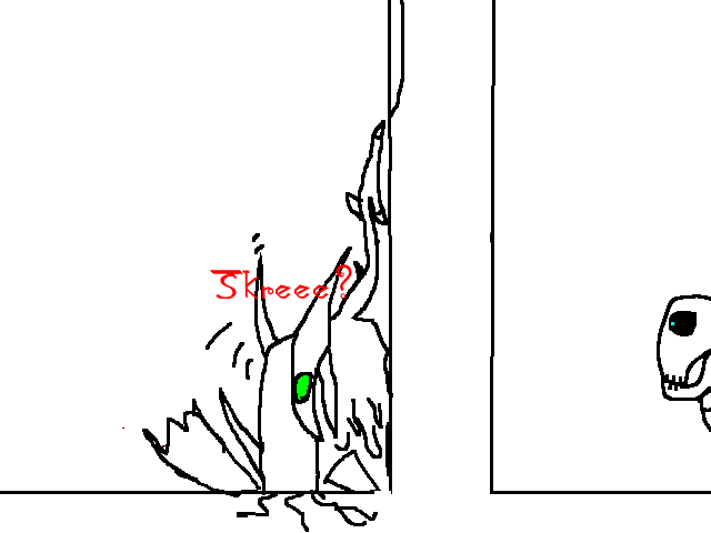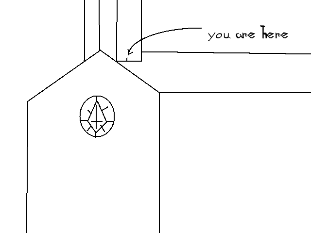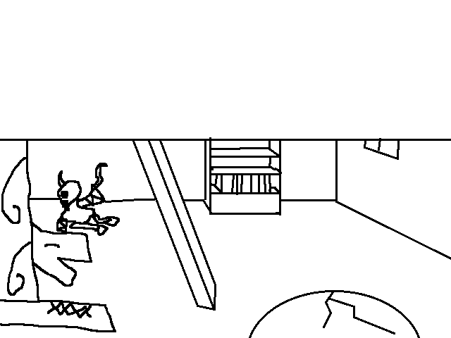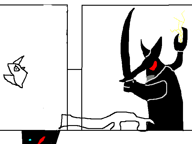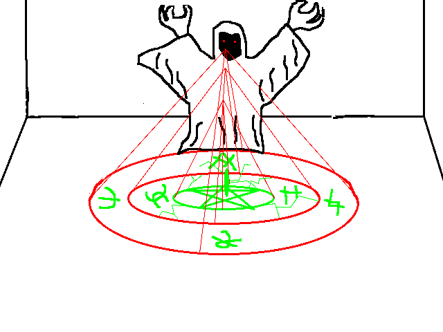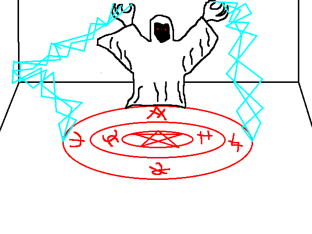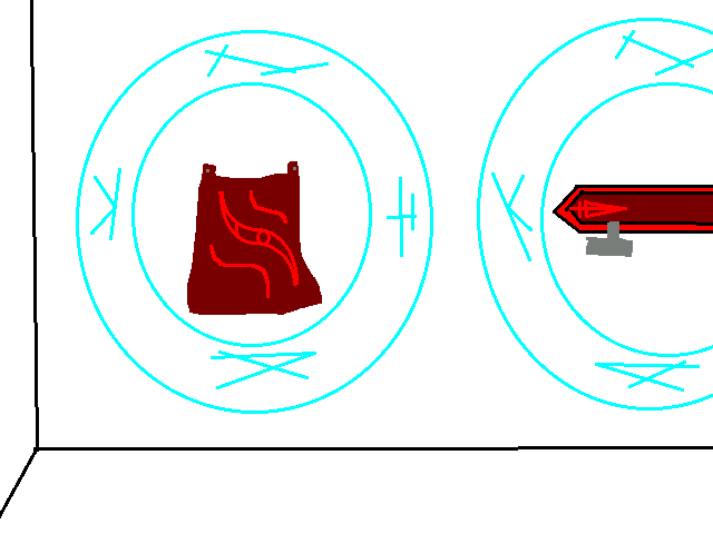It's a big room, long and wide. On the wall opposide the stairs is a series of seven displays, each with the same shit that Awk was stuck in, 'cept blue. I can feel something like when he promised to me, and when the shady dude charged that lightning think, only it's... worse. It's oppressive, incredible. There's writing on the near wall, but I can't read it. The first two displays have a cloak and a huge sword, the other five are empty.
