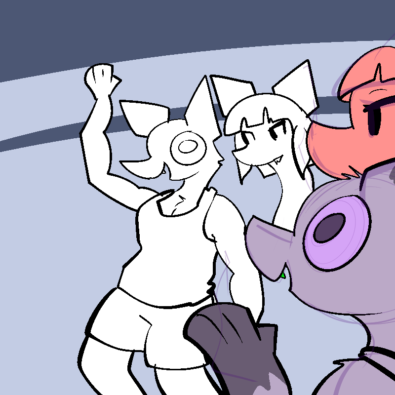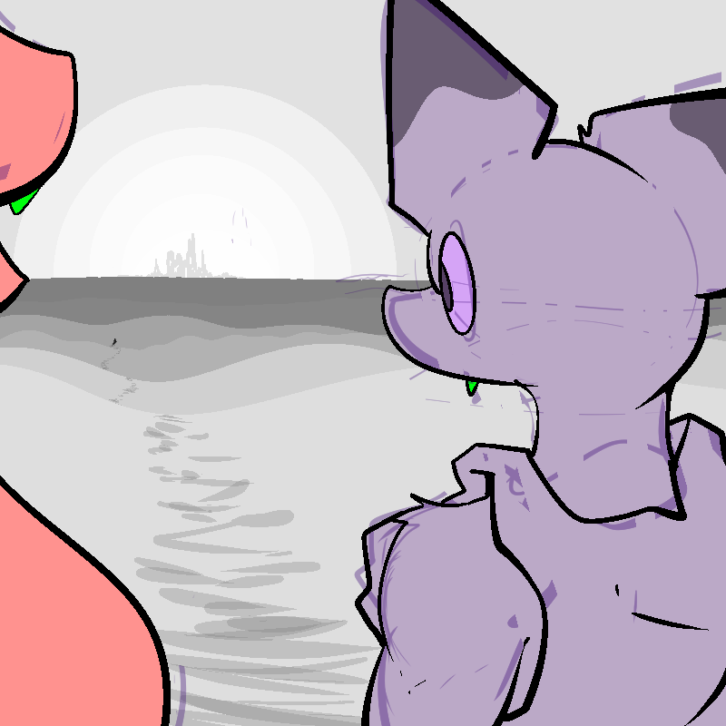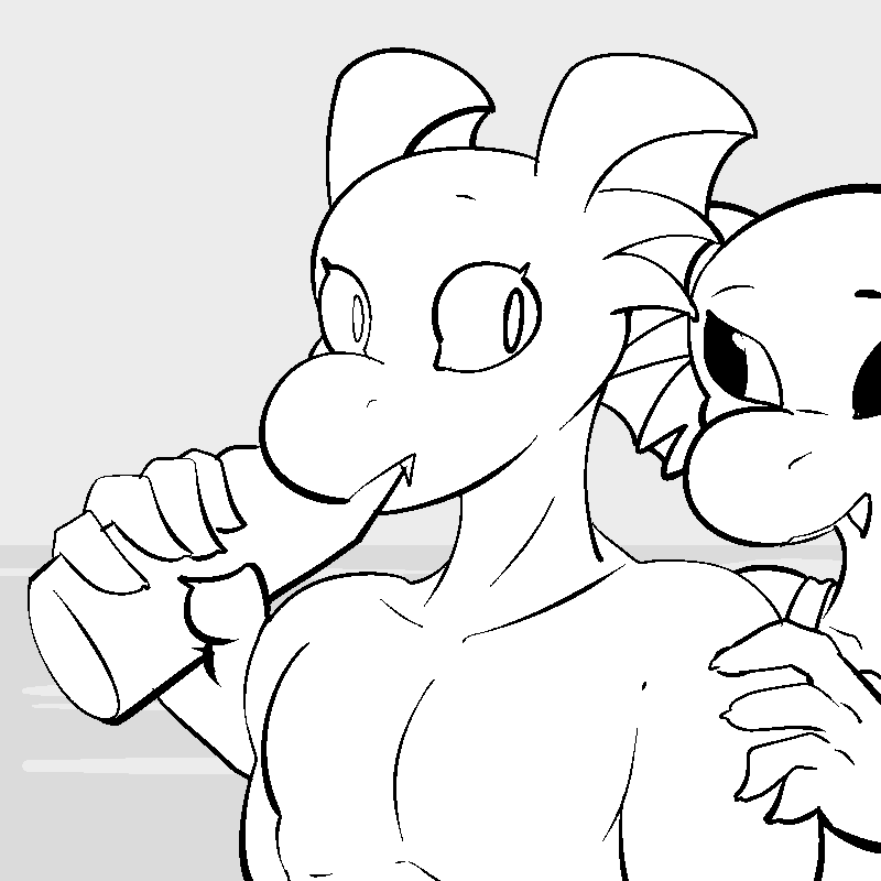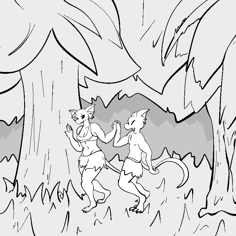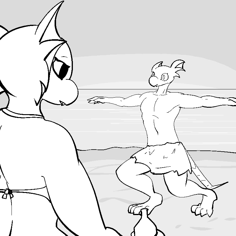 Second: Physique! You want to both be well-proportioned, and to have nice equally balanced muscles all over. In your case, Glitcher, as the guy, you'll probably want to have some more emphasis of muscles around the torso, across your chest and back, your butt and your shoulders and arms. Maybe make your hands a little bigger than average. But don't neglect anything else! And while you should both clearly have some muscles, don't overemphasize them. In fact, you could probably both do with being a little chubby! Primitive societies associate being well-fed with wealth and power. Rulekeep probably a little more than you because in those groups often guys are more expandable than girls and are more likely to get sent out to do dangerous physical things. She may want to emphasize her chest, have a nice curve to her shoulders and long legs, and bump up her butt and hips a little, though they look pretty good already (Not sure why pomi femininity would be associated with wide hips, given that they lay small eggs. Both sexes would probably start off with somewhat big hips to anchor the tail better, and the butt would probably still be a sexual attraction target thing, so maybe it would have been emphasized by evolution just for that, like baboons only size instead of color). You want to both look strong and like you're nowhere near starving. Nice smooth shapes, no sagging or wrinkling. It would probably be a good idea to get feedback from each other! Your body will probably have come preloaded with a sense of what it's attracted to and Rulekeeper's what it's attracted to, so try out a few variations within the tall-strong-cushioned range and talk to each other about what seems to get a good reaction.