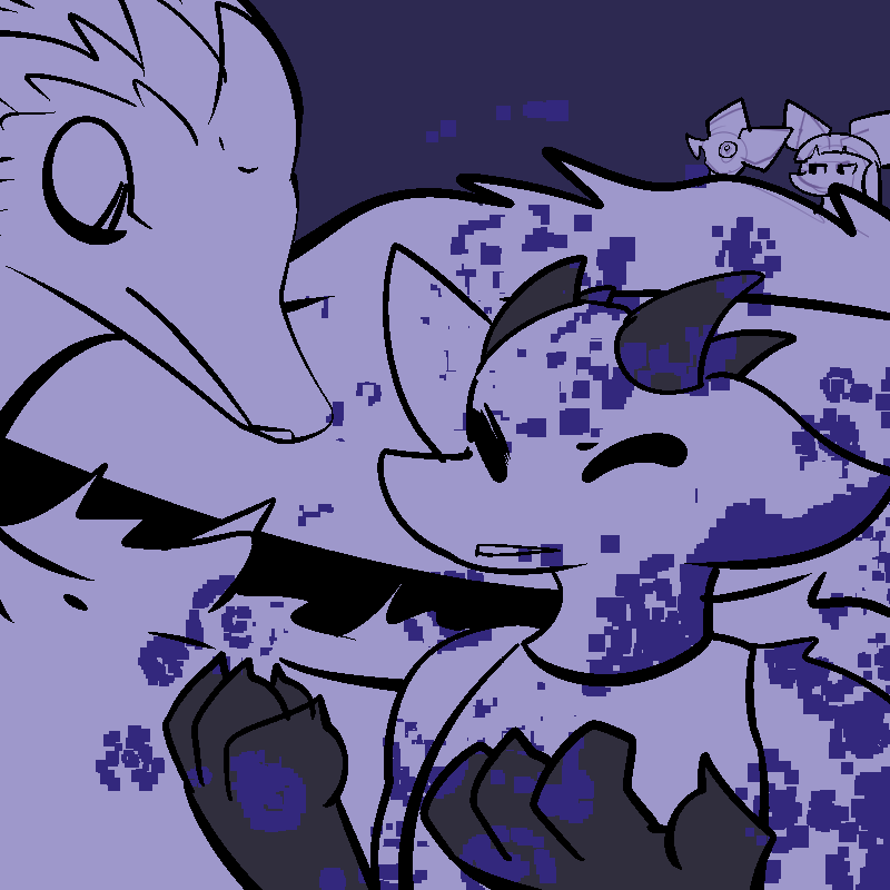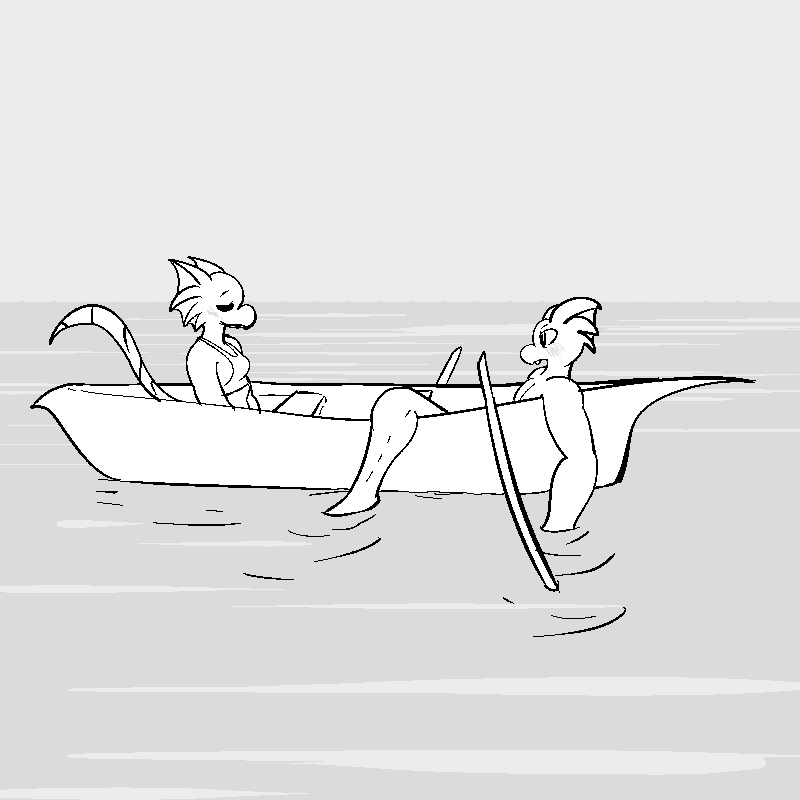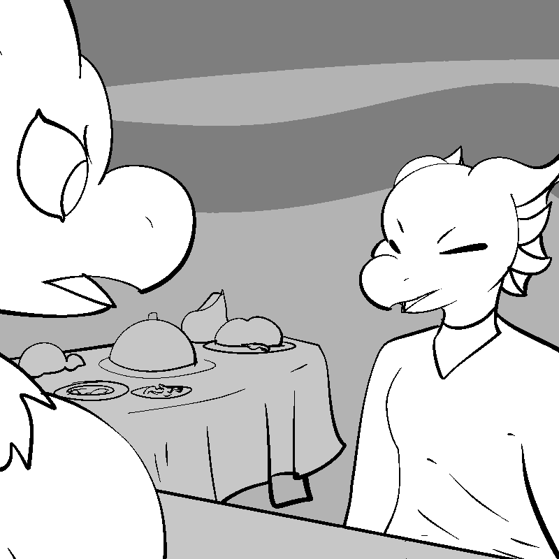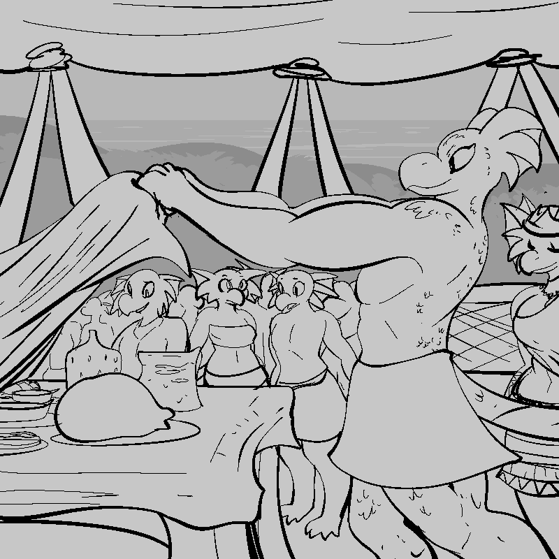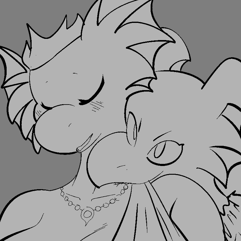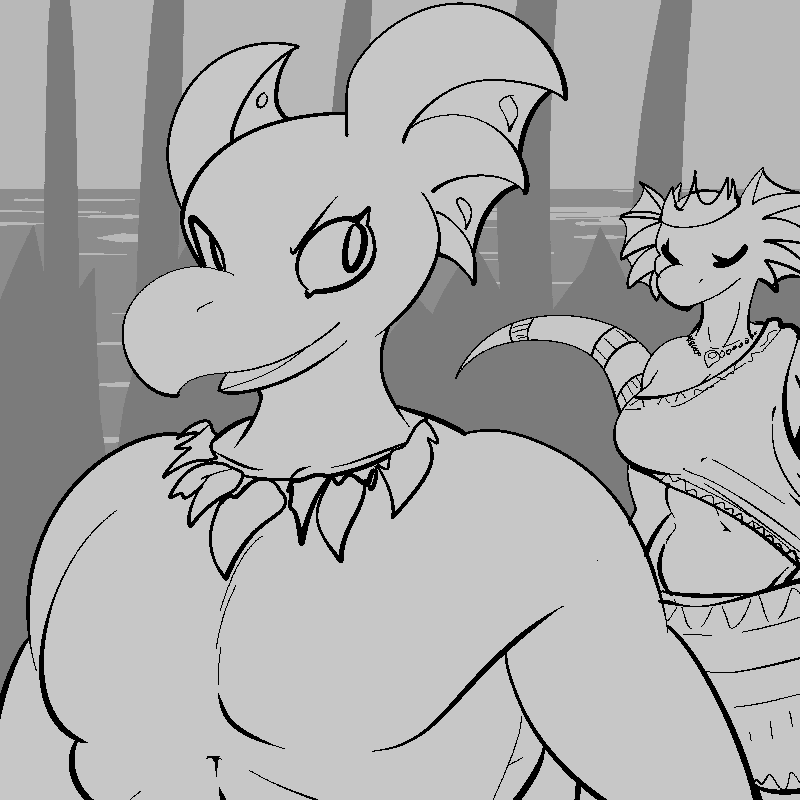 Third: Style! Theme! Gods are generally gods of something. So, you're the Chaos god and Rulekeeper is the Law god. You should look a little roguish, a little more wild and worn, maybe with rougher scales (so long as they still feel good to touch - get Rulekeeper to try it out), and maybe give yourself some cool scars. Give them a darker color, and maybe include some variation? Do pomi ever get patterns or patching on their scales? Well, if not, you're a god so maybe do that anyway. Keep your weird frill style but make it a bit longer. You'll dress in natural stuff, leathers and feathers and bones and shells and leaves, and give yourself whatever the pomi equivalent of tattoos are. As for Rulekeeper, being the Law goddess, she should be nicely smooth-scaled, and one color but something bright and warm, with a nice sheen so that she looks radiant. As opposed to you, she'll wear refined, manufactured things: woven cloth for her skirt and top, dyed and embroidered, and a bunch of jewellery made of refined precious metals and cut and polished gemstones, necklaces and bracelets and anklets and belly chain and frill piercings and things. Speaking of, her frills could probably do with being unusual as well, but in a nice lovely regal way, like a sort of headdress effect. In both cases you should both dress pretty skimpy. Gods have no need of protection, and nothing to be ashamed of!