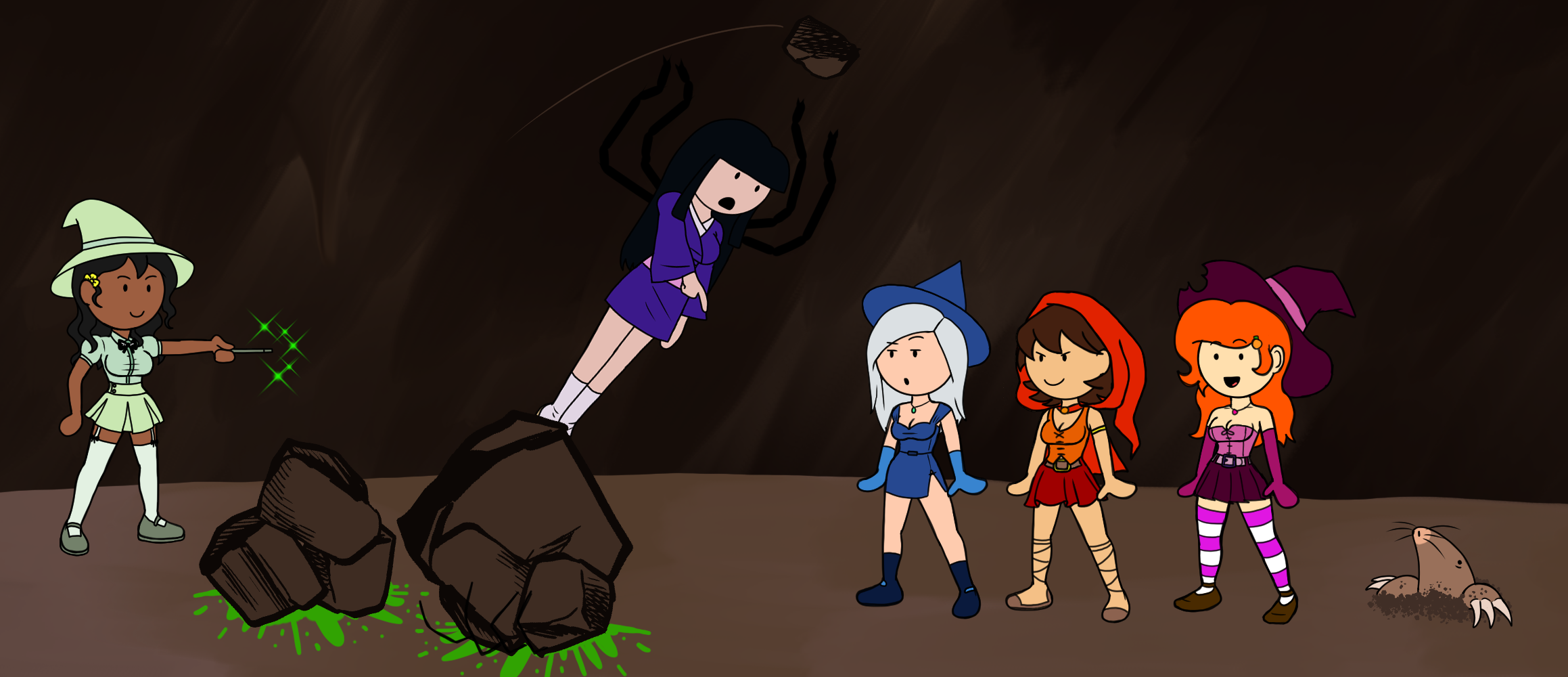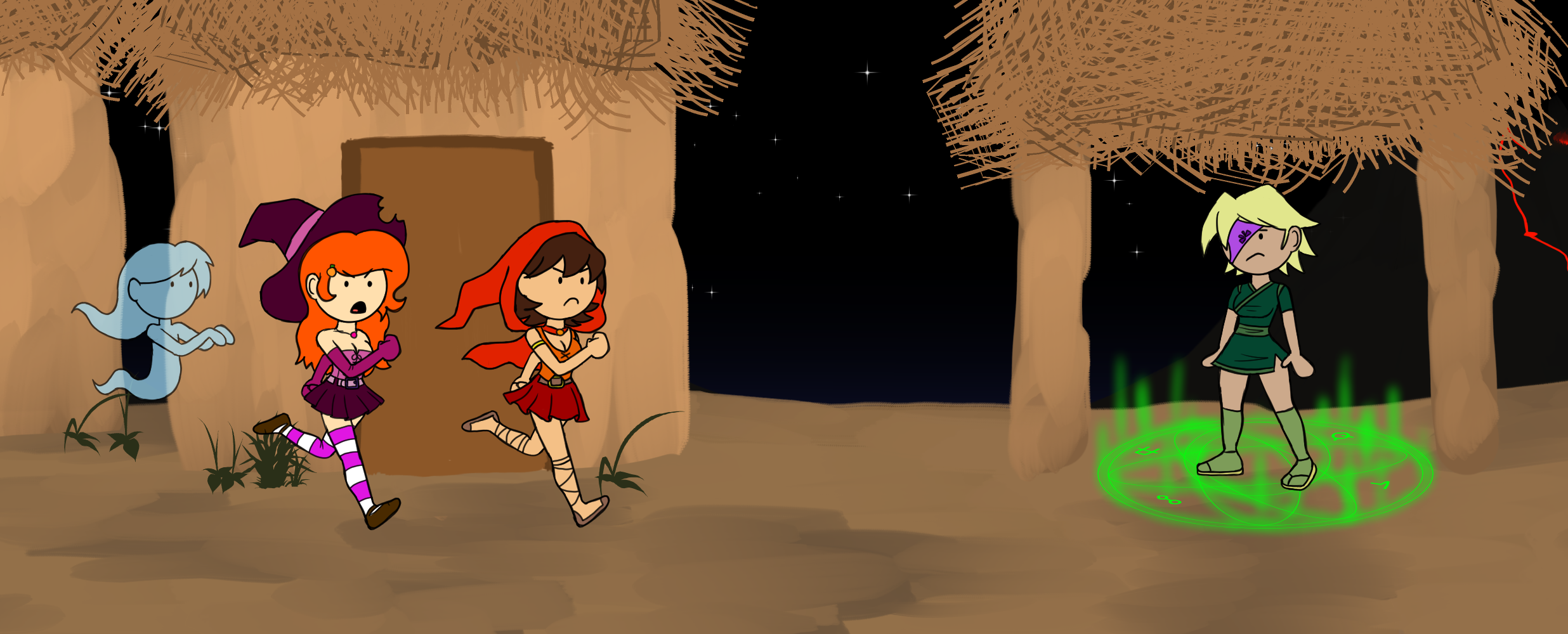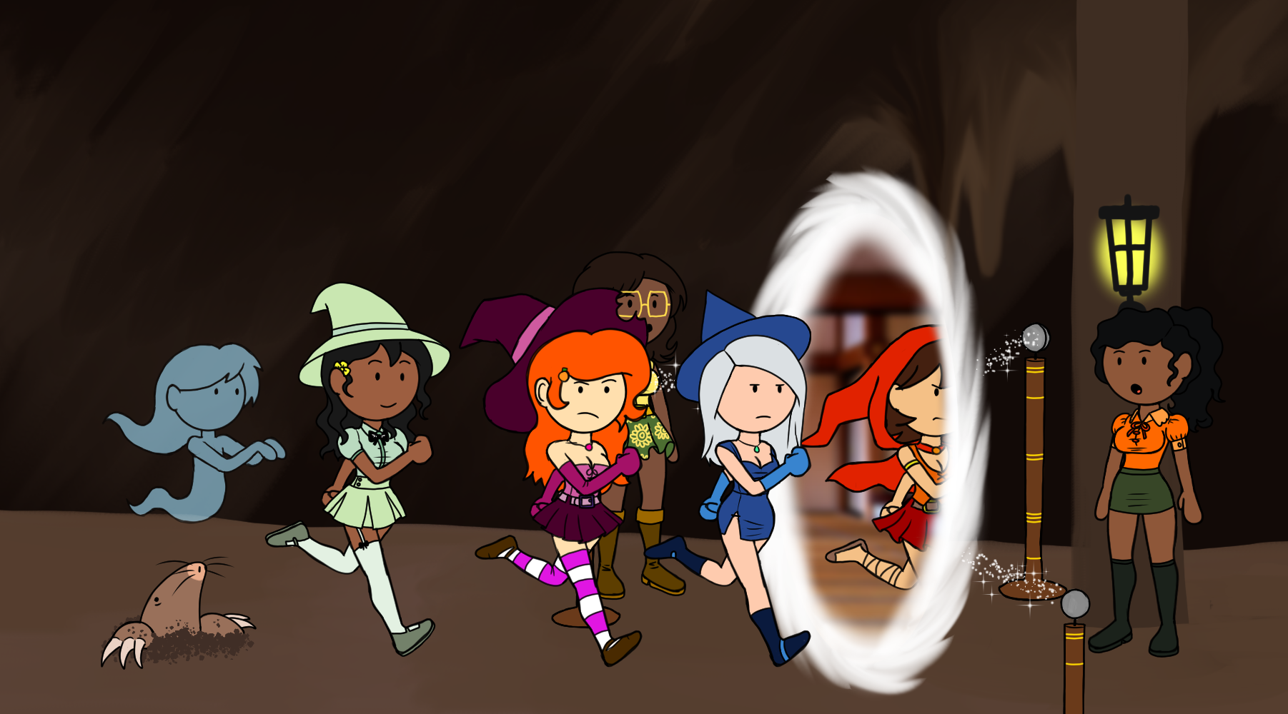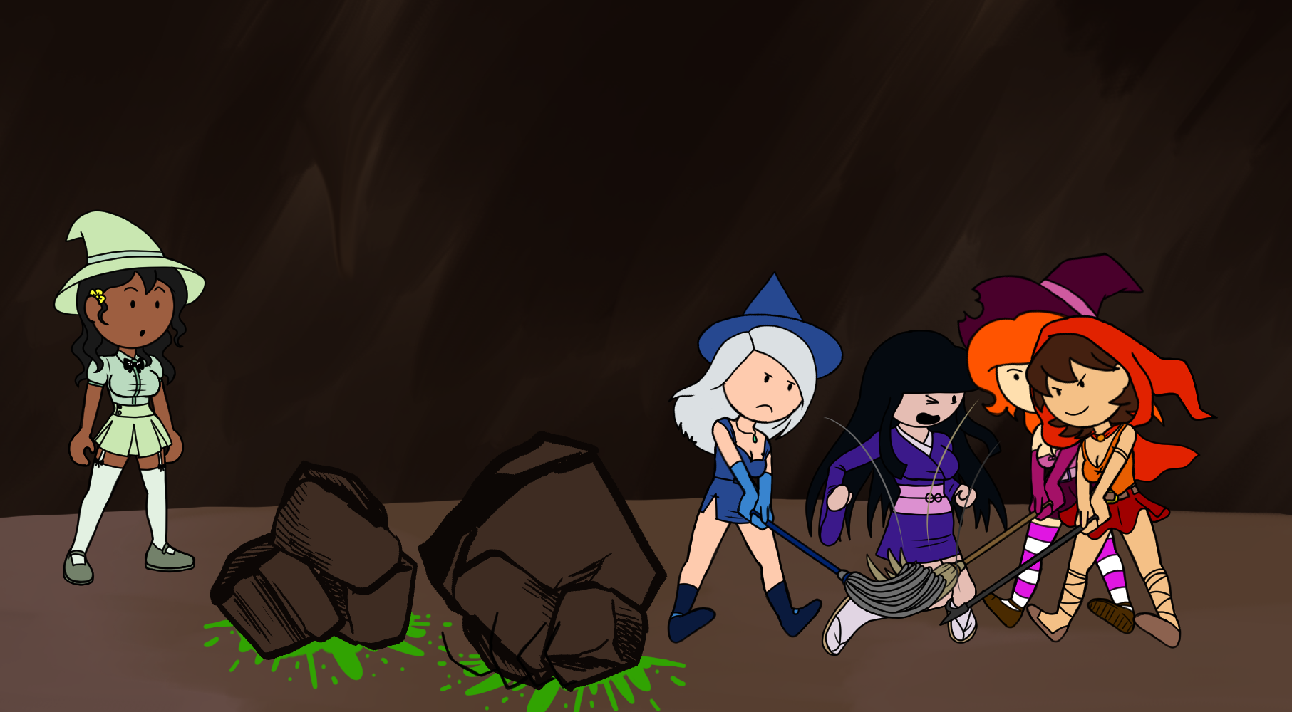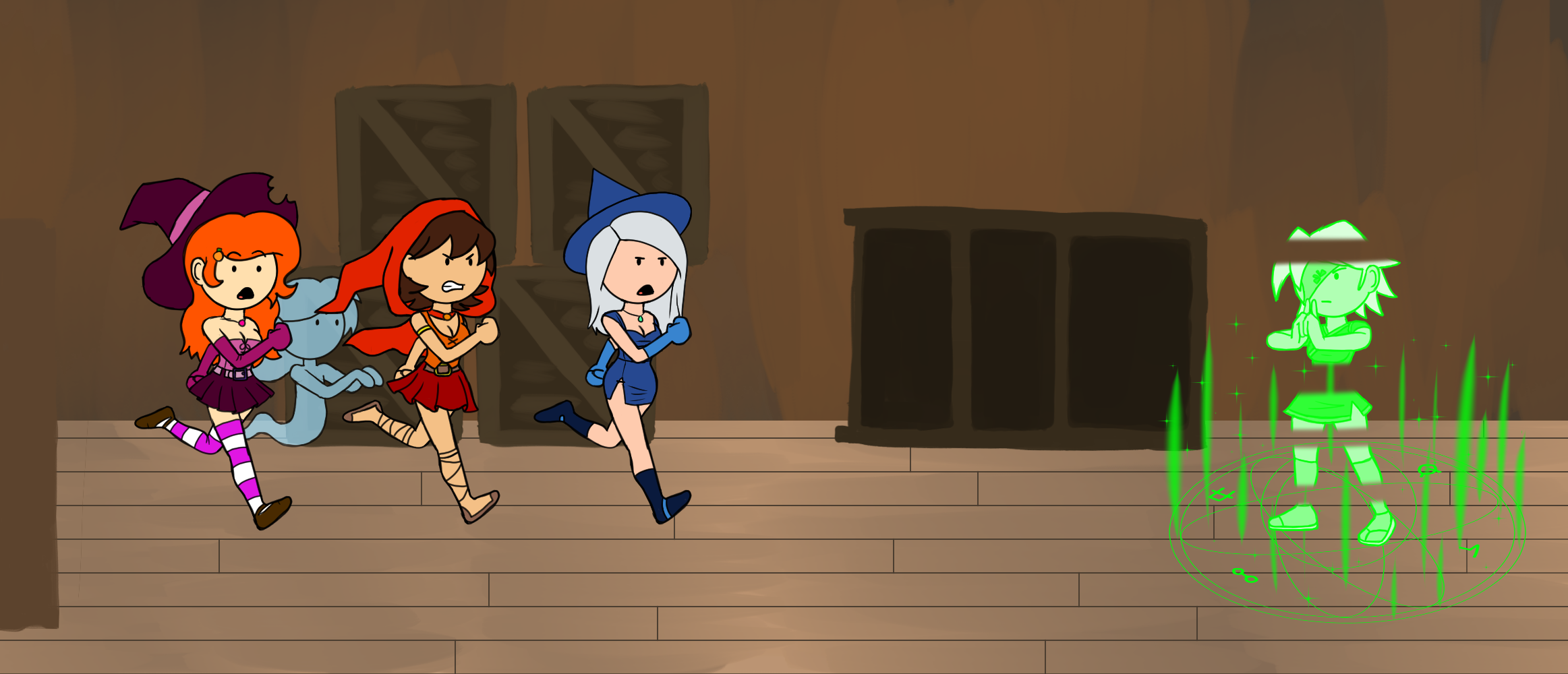 The witches all summon their flying implements, mount them, and take off at all speed down the long hallway. During the escape, a massive golem fist punches through the floor, sending splinters and some unfortunate ninjas flying through the air.